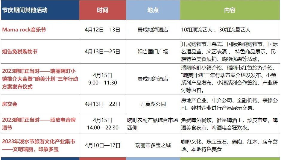 4月15日 14:00—17:30 | 弄莫湖公园南门白象广场(主会场) | 举行傣族传统歌唱表演及民族风俗活动 |