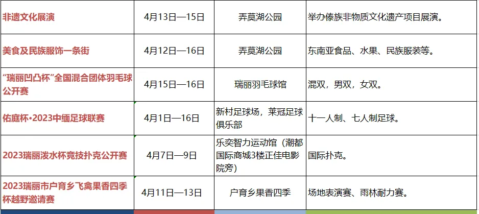 4月13日 9:00—14:00 | 瑞丽市植物园(勐秀乡南京里) | 举行采赏建花、嘎伴光、对歌、丢包、共享“民族团结包饭”等传统活动) |
