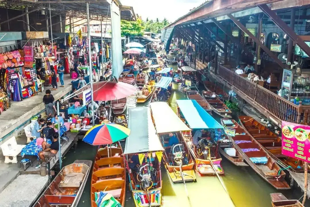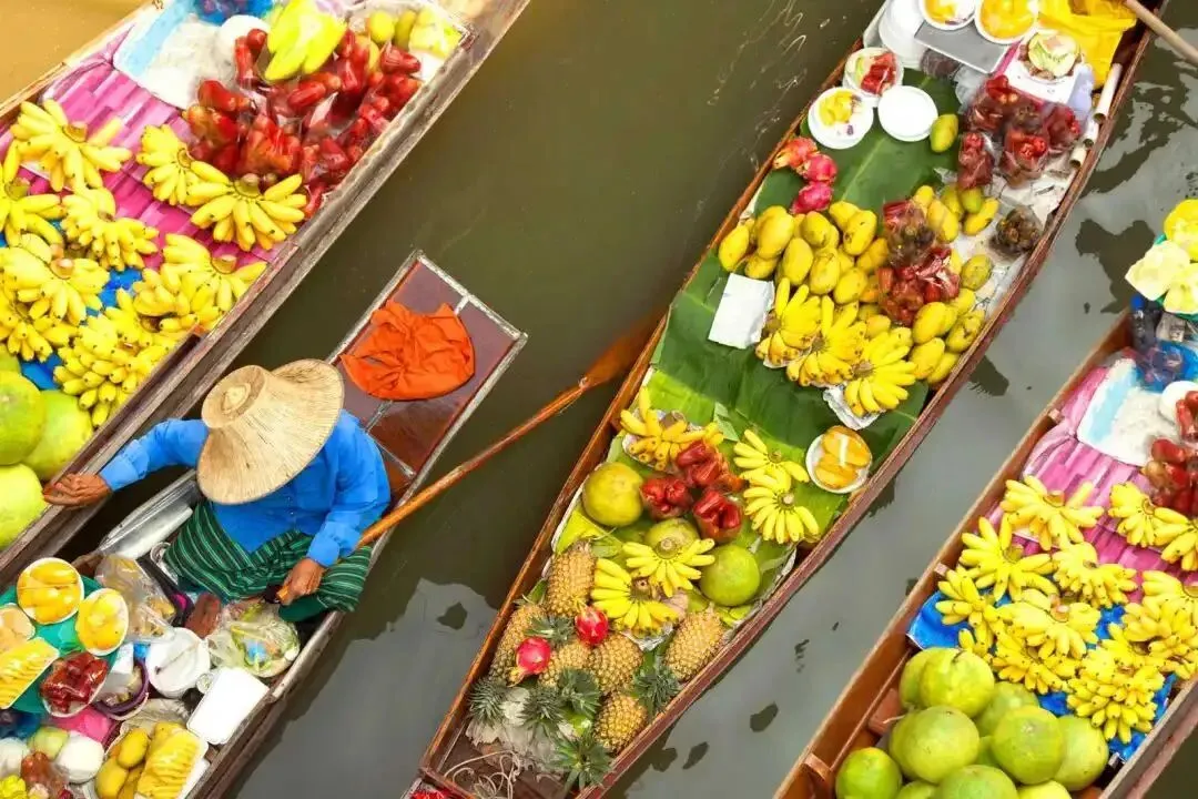 丹嫩莎朵是曼谷水上市场的先驱,虽观光味渐浓,但仍保留地道体验。游客可见手划木船满载新鲜果蔬鲜花,小吃摊贩在船上烹煮船面或海鲜串。市场距曼谷西南约100公里。