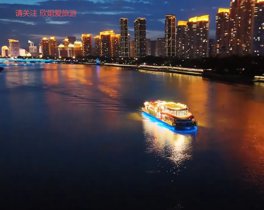 闽江夜游航线主要航行于闽江中下游黄金水道,从台江码头起航,途经闽江大桥、鳌峰大桥、海峡金融商务区、花海公园等景点,穿过约15公里的闽江夜景景观带,在鼓山大桥折返回台江码头,航程约60分钟。该航线由"闽江之星""闽江会客厅"等电动客船执行,其中"闽江会客厅"是福建省最大、闽江上最高端智能的纯电动客船。