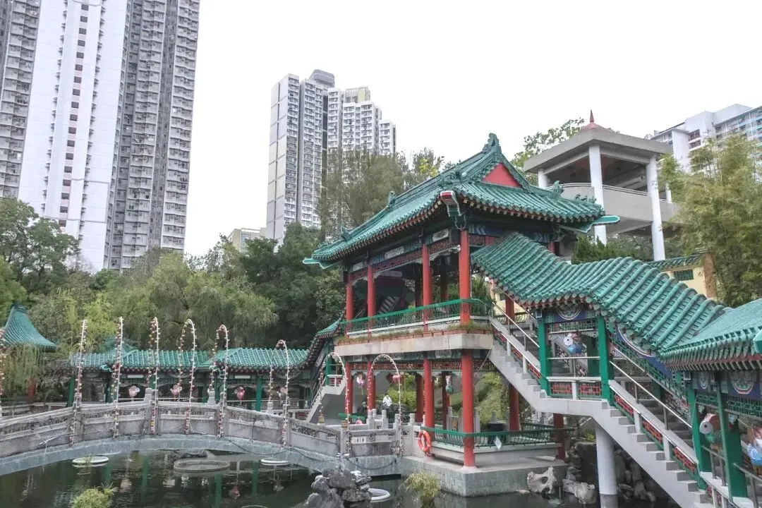 黄大仙祠旁设有小公园,设计得宜,精巧玲珑,颇具园林景色。旁侧的九龙壁,是仿照北京故宫而制。现列黄大仙祠已列作香港一级历史建筑。