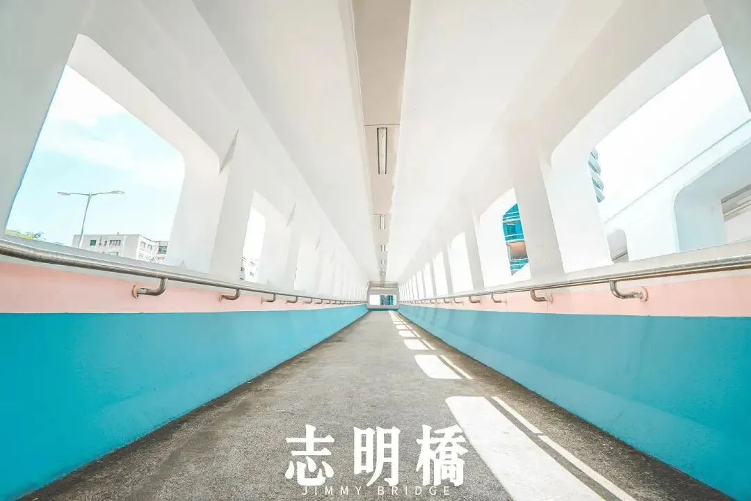 这座桥与普通的桥有所不同,以粉色系粉蓝、粉红和白色形成清新的气息,加上与众不同的长方型的通风口设计,很有文艺气息。