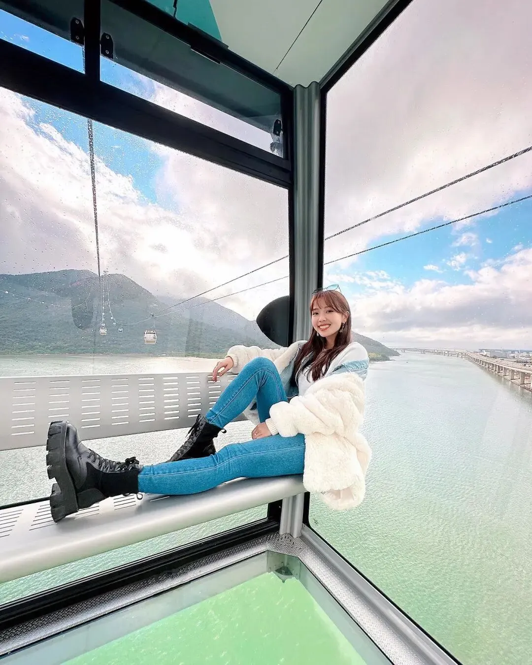 在这25分钟里,你可以从通过透明的车底,俯瞰港澳珠大桥等壮观景致,也可以拍摄出各种令人惊艳的缆车大片,前提是不恐高~