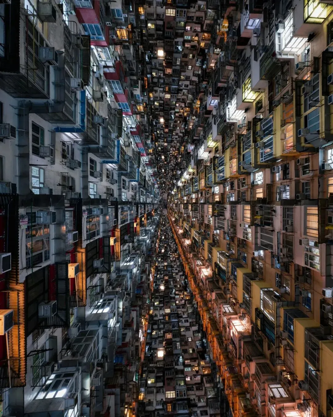 由五栋楼组成的密集的建筑群,从下往上仰望,可以拍出城市奇观!