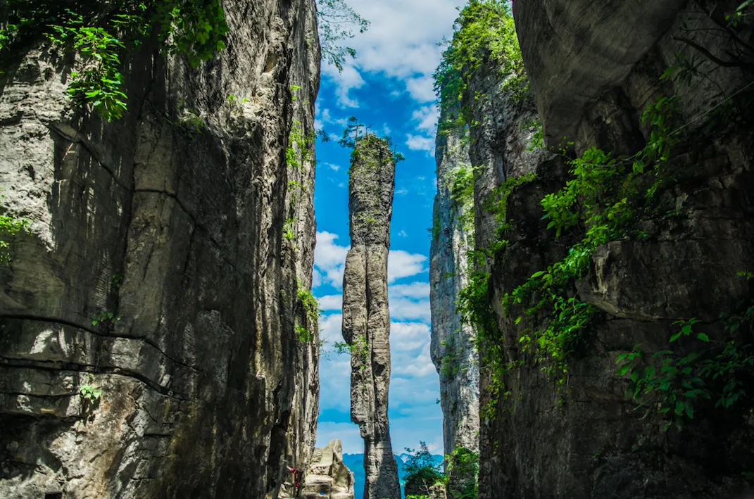 尤其是峡谷内的镇谷之宝,一炷香,150多米高的石柱,最小直径却只有4米,傲立群峰之间,蔚为壮观。
