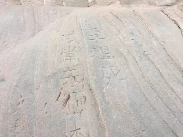 看着岩石上被游客留下的刻痕和划痕