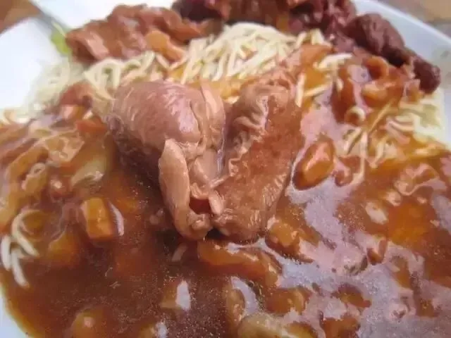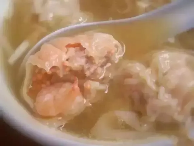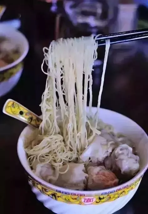 这里吃的细面与北方的面条完全不一样,用鸭蛋和面,人再骑在毛竹的一边,用另一边碾压面团。而汤底有鲜美的碱水味,云吞压在面条下面,这样面条才不会太快被泡软。云吞做得非常传统,却非常美味。