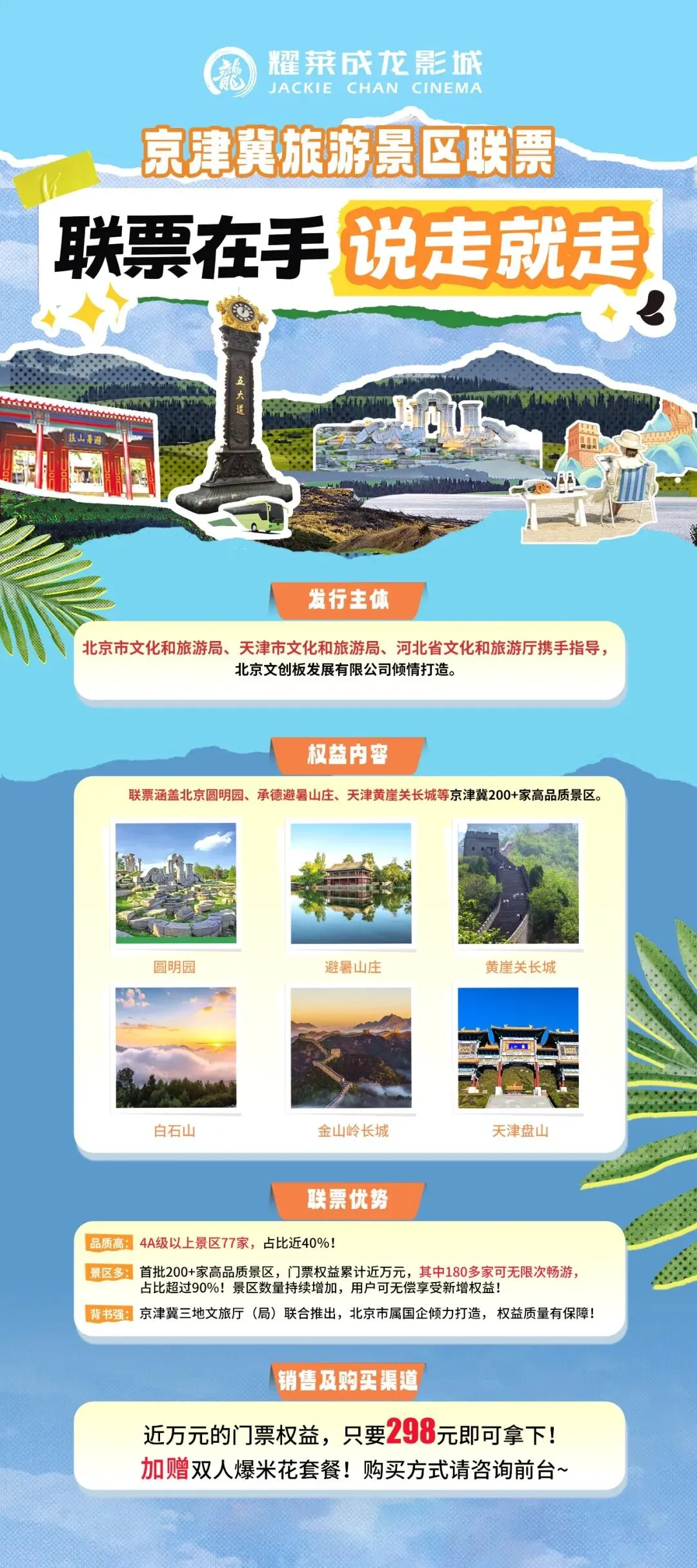 即日起,北京及河北所有耀莱成龙影城将限量发售“京津冀旅游景区联票”,不仅全年畅游京津冀多家知名旅游景区,更可0元领双人卖品套餐!