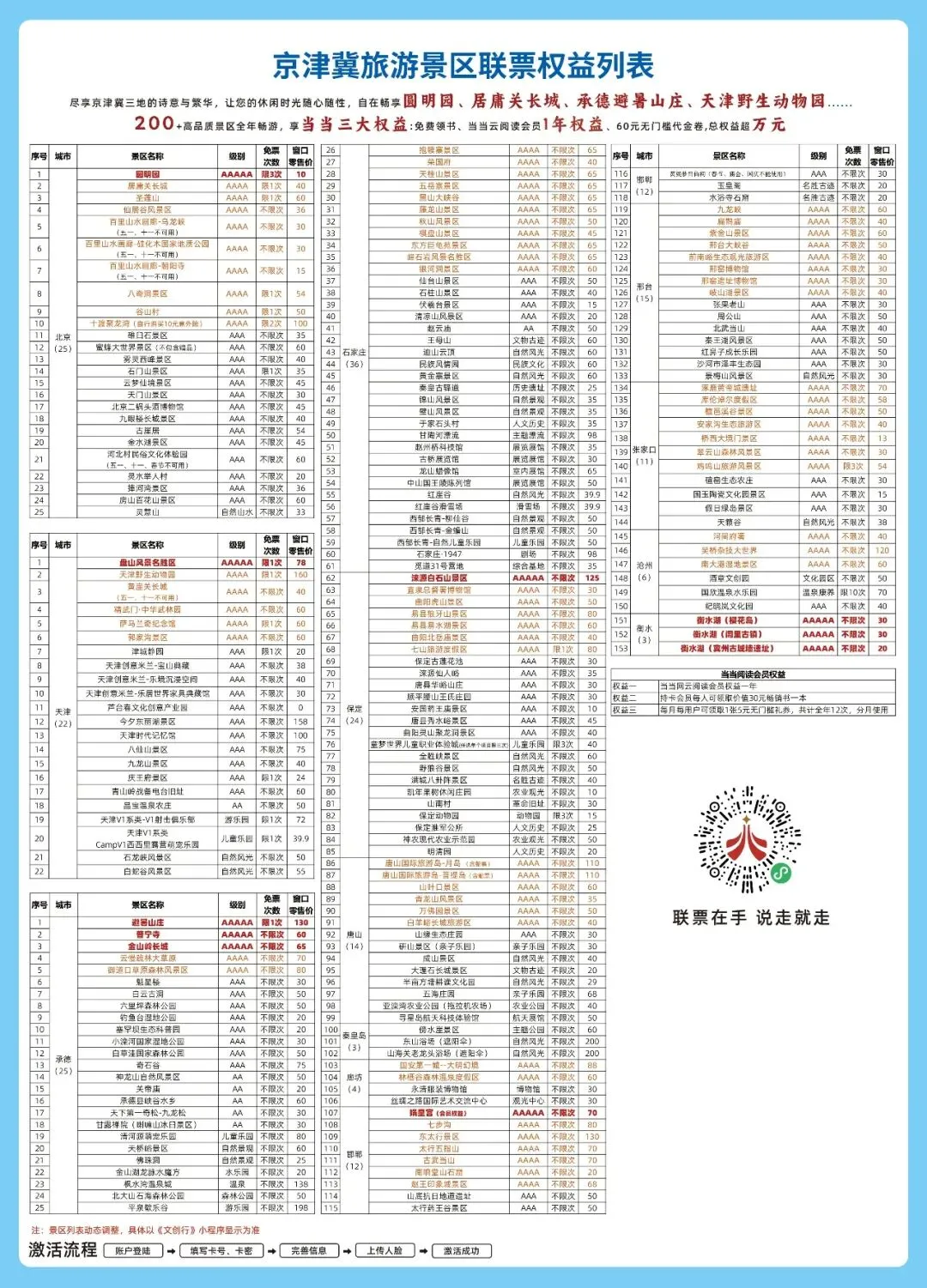 包含权益:1️⃣ 京津冀旅游景区联票持卡可享受覆盖北京、天津、河北三地的多家知名景区门票优惠或免票权益