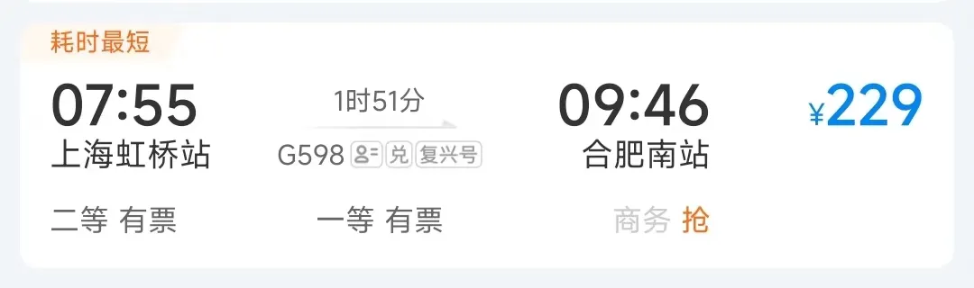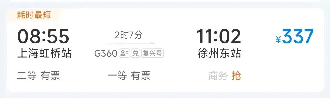 高铁最快运行时间:2小时7分钟