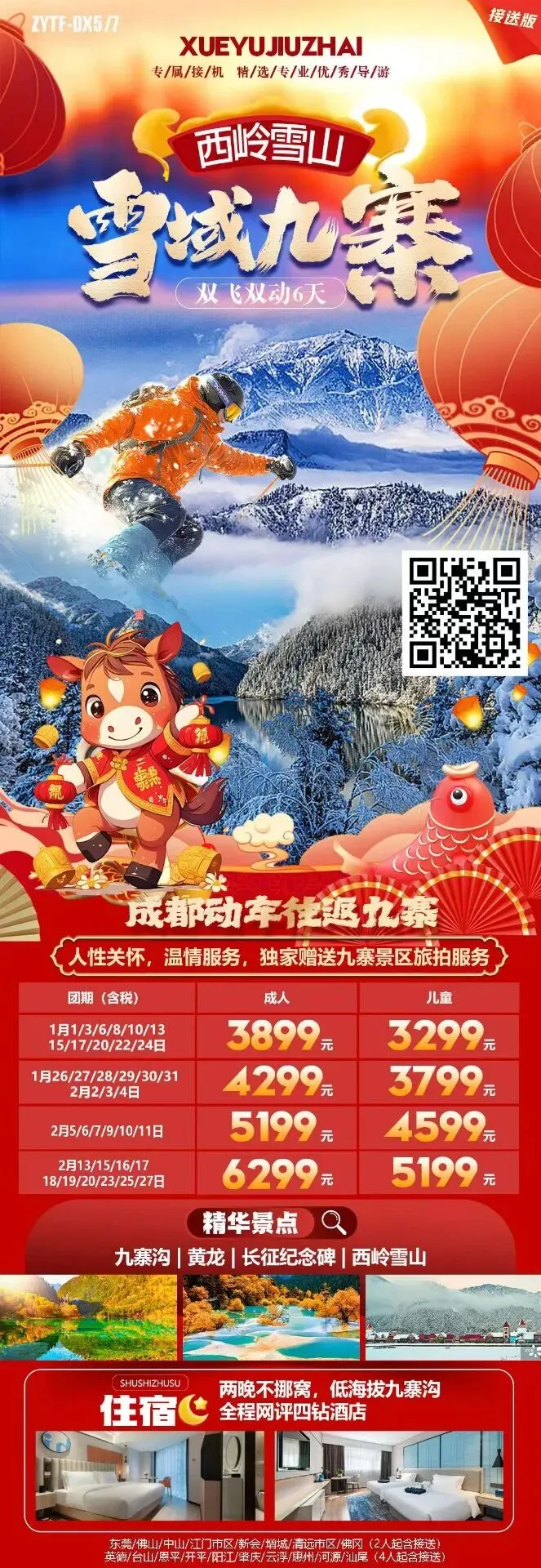 【雪域九寨】-西岭雪山双飞双动6天 直飞成都成都动车往返九寨 劲省14小时车程王牌景点:九寨沟/黄龙/西岭雪山暖冬行动:西岭雪山滑雪体验舌尖美食:农家菜+藏式火锅+牦牛汤锅舒适住宿:精选网评4钻酒店