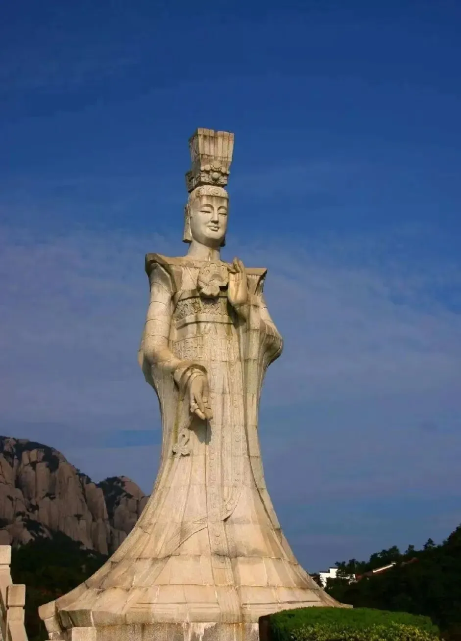 太姥娘娘雕像左边是乌龙岗,右边是虎头岗,前眺东海福瑶列岛,背靠摩霄峰。雕像由288块花岗岩组成,叠高18层,高20.88米(含基座),台阶的台数、级数,都暗合道教所推崇的数字“九”。雕像造型方中有圆,以方为主,吸收了北魏石窟雕像的秀骨清相的特点,揉进少许盛唐时代人物面部的丰润,同时又从汉俑中吸取单纯简洁之韵味。