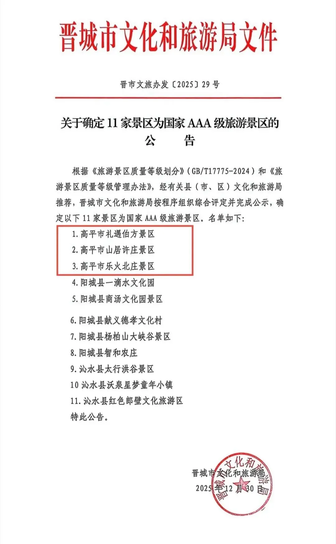这不仅是三家景区的荣誉,更是高平文旅融合发展的一次重要突破,标志着高平旅游服务设施、管理水平、文化内涵和游客体验全面迈上新台阶,为我市旅游高质量发展注入强劲动力。