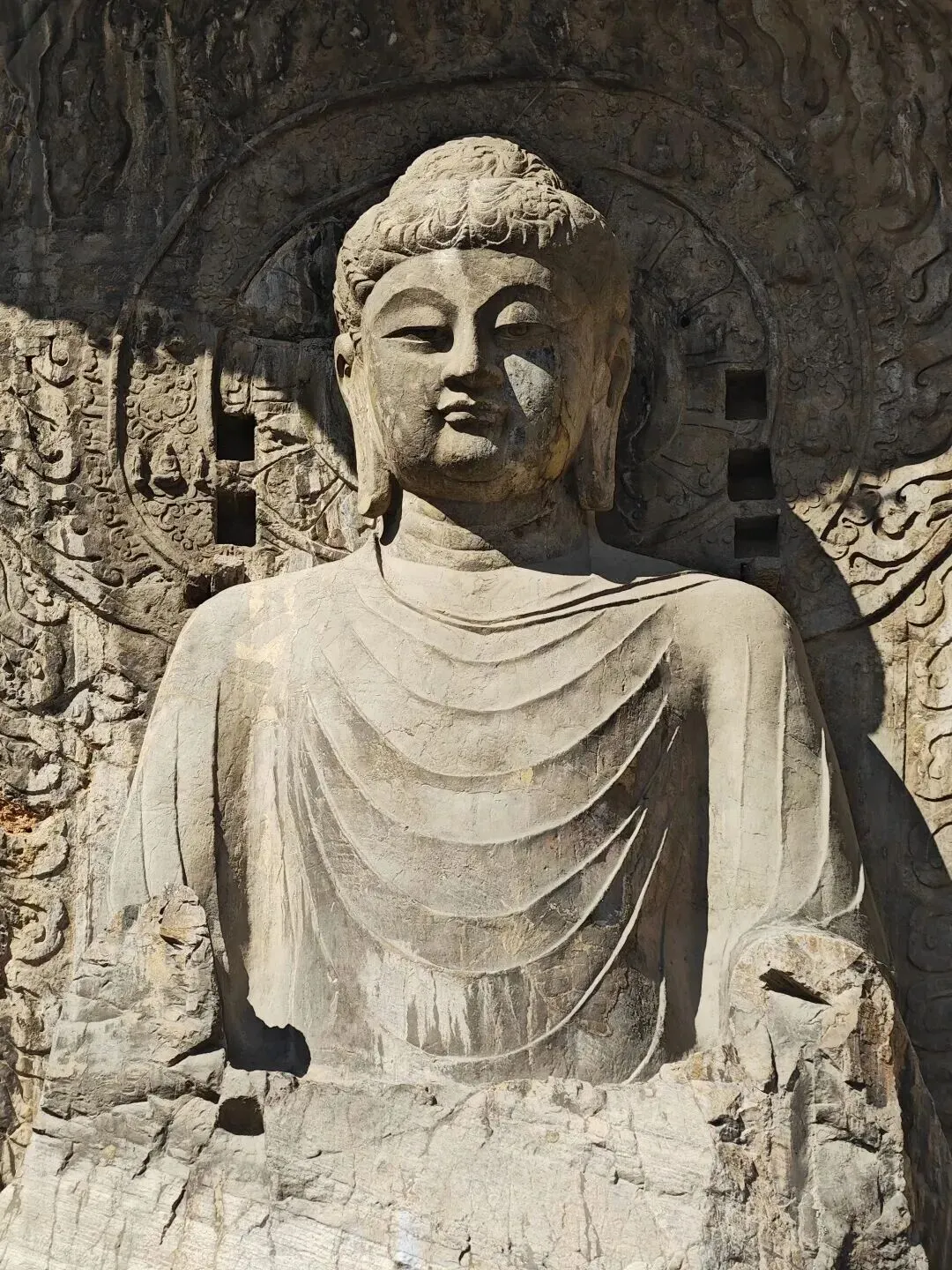沿着伊水漫步,西山峭壁上的石窟如同蜂巢般次第展开。宾阳洞保存着北魏时期的精美造像;万佛洞内刻有上万尊小佛像,密密麻麻;莲花洞、奉先寺等洞窟各具特色,令人目不暇接;卢舍那大佛面庞丰腴,双耳垂肩,眉眼细长,嘴角微扬,带着慈悲的微笑。无论你从哪个角度欣赏,都能感受到她那仿佛洞察世事般的目光。