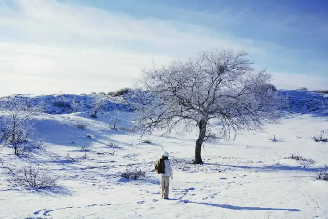 14:00抵达乌苏浪子湖,霜花满枝,雪花与晨光交织成秘境。