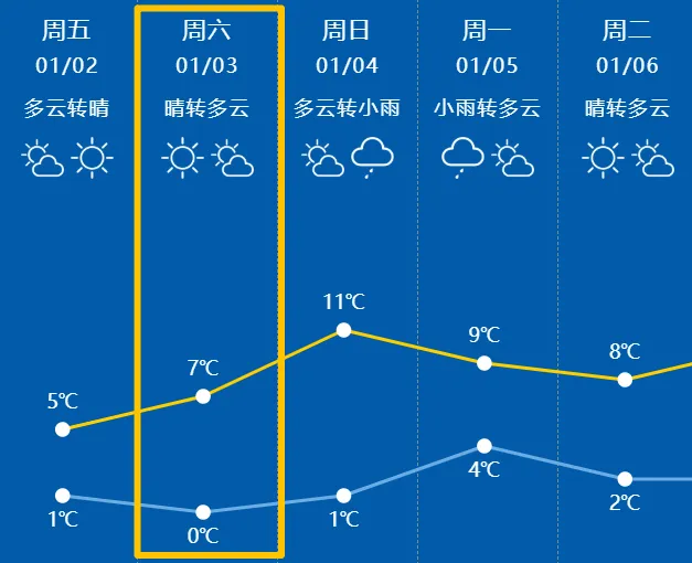 ■ 明天寒意升级,市区最低气温只有0℃左右,郊区将出现零下5℃到零下3℃的冰冻天气。后天最高气温回升至两位数。下周多冷空气扩散影响,气温难有明显回升。