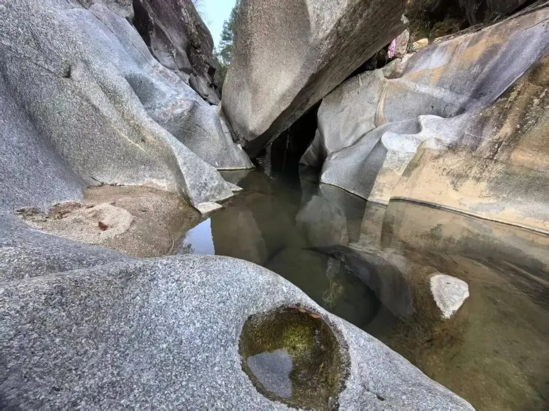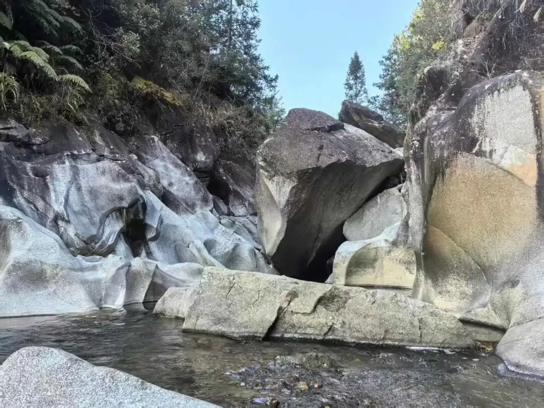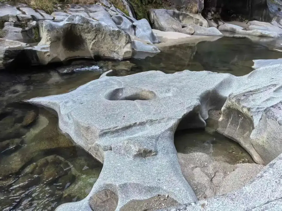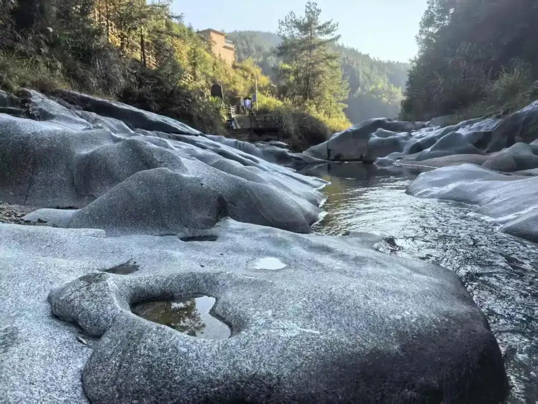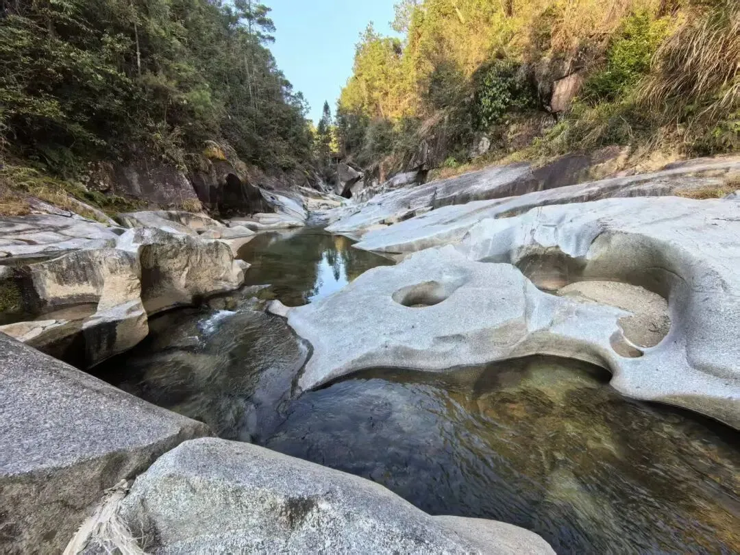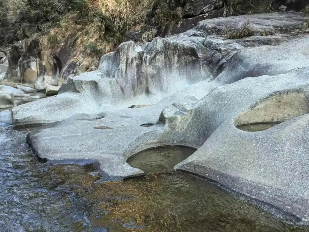 桂东的旅游景点大多数都是免费开放的,当你来到江山冰臼群,还未近前,那淙淙的水流声便先入耳来。走到涧边,视野豁然开朗,一幅地质奇景便毫无保留地铺展在眼前。但见一条清冽的溪流,在嶙峋的乱石间婉转流淌,而溪床中那些星罗棋布、形态奇崛的冰臼立刻攫住你的心神。这些冰臼大小不一,深浅各异,布满了整片花岗岩河床。有的浑圆如碗,边缘光滑流畅;有的深邃如井,口小肚大,幽深的臼底蓄着一汪墨绿色的潭水;有的则如巨大的浴盆,内壁被水流打磨得温润如玉;更有那三五相连,串珠似的排列着,水流依次漫过,形成一叠小小的、白色的瀑花,欢快地跳跃着。