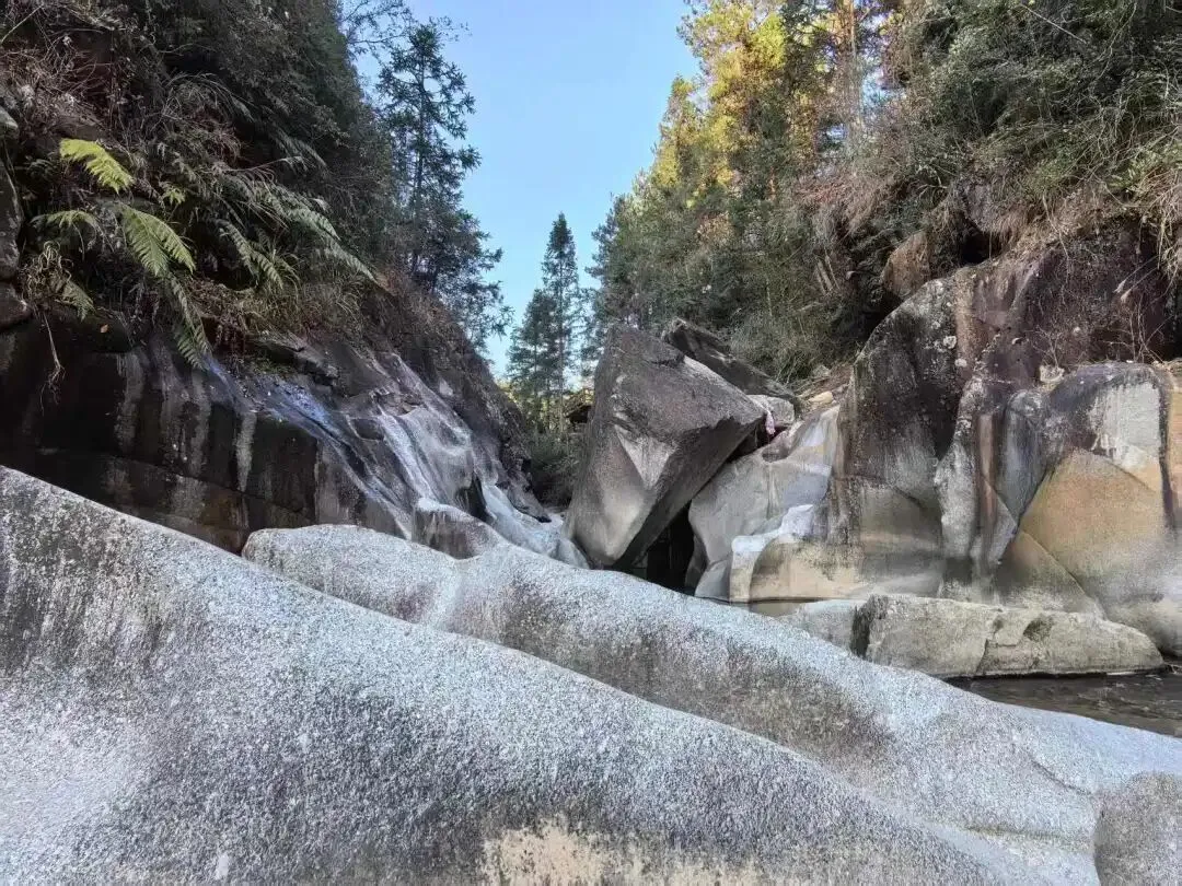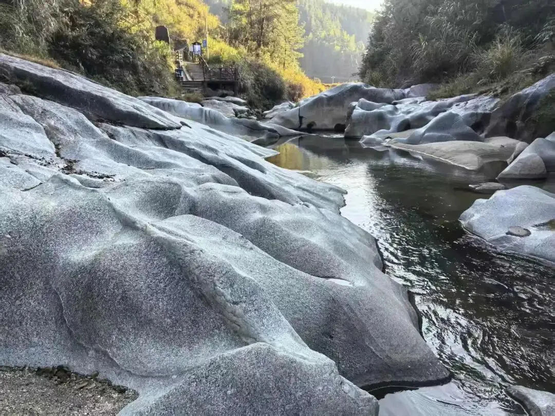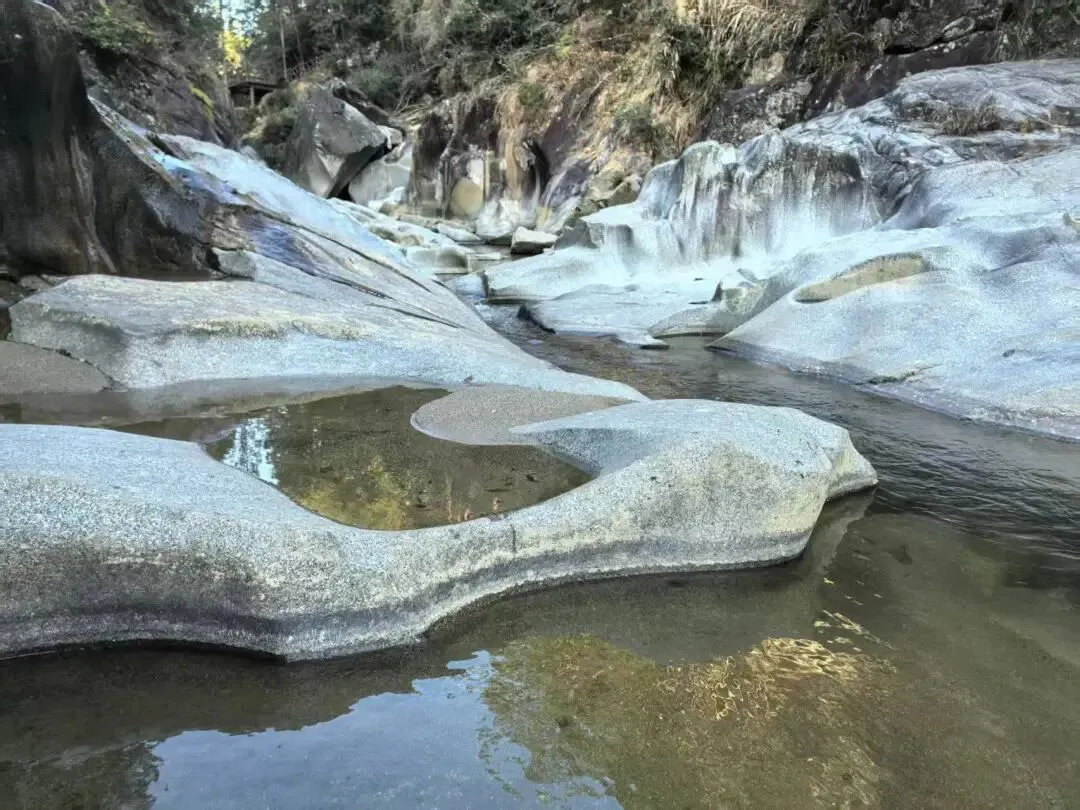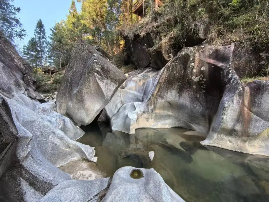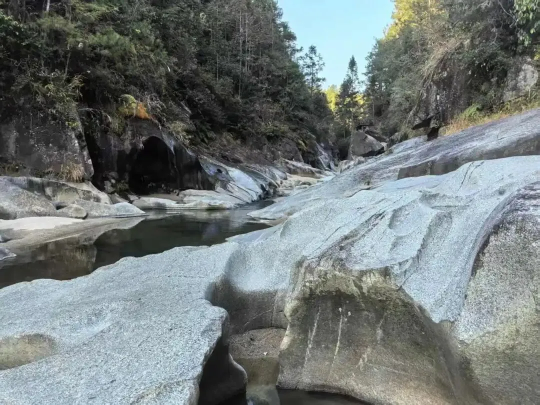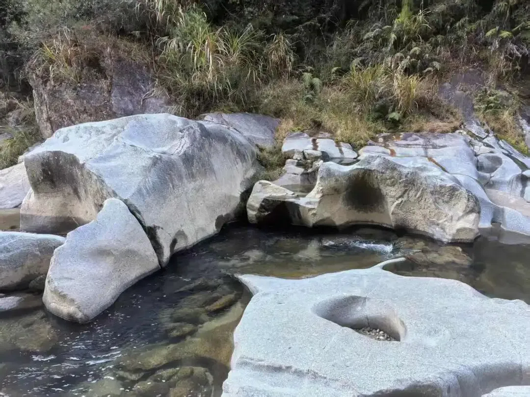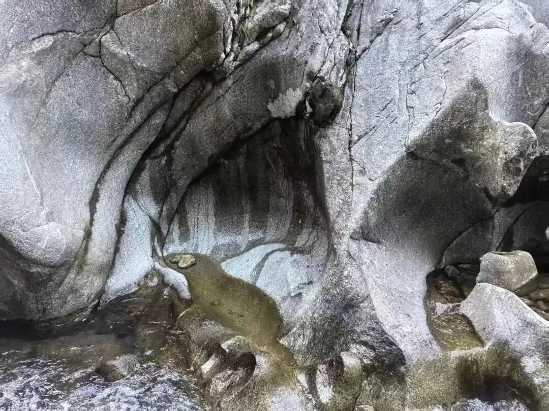 桂东的旅游景点大多数都是免费开放的,当你来到江山冰臼群,还未近前,那淙淙的水流声便先入耳来。走到涧边,视野豁然开朗,一幅地质奇景便毫无保留地铺展在眼前。但见一条清冽的溪流,在嶙峋的乱石间婉转流淌,而溪床中那些星罗棋布、形态奇崛的冰臼立刻攫住你的心神。这些冰臼大小不一,深浅各异,布满了整片花岗岩河床。有的浑圆如碗,边缘光滑流畅;有的深邃如井,口小肚大,幽深的臼底蓄着一汪墨绿色的潭水;有的则如巨大的浴盆,内壁被水流打磨得温润如玉;更有那三五相连,串珠似的排列着,水流依次漫过,形成一叠小小的、白色的瀑花,欢快地跳跃着。