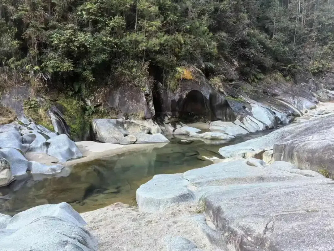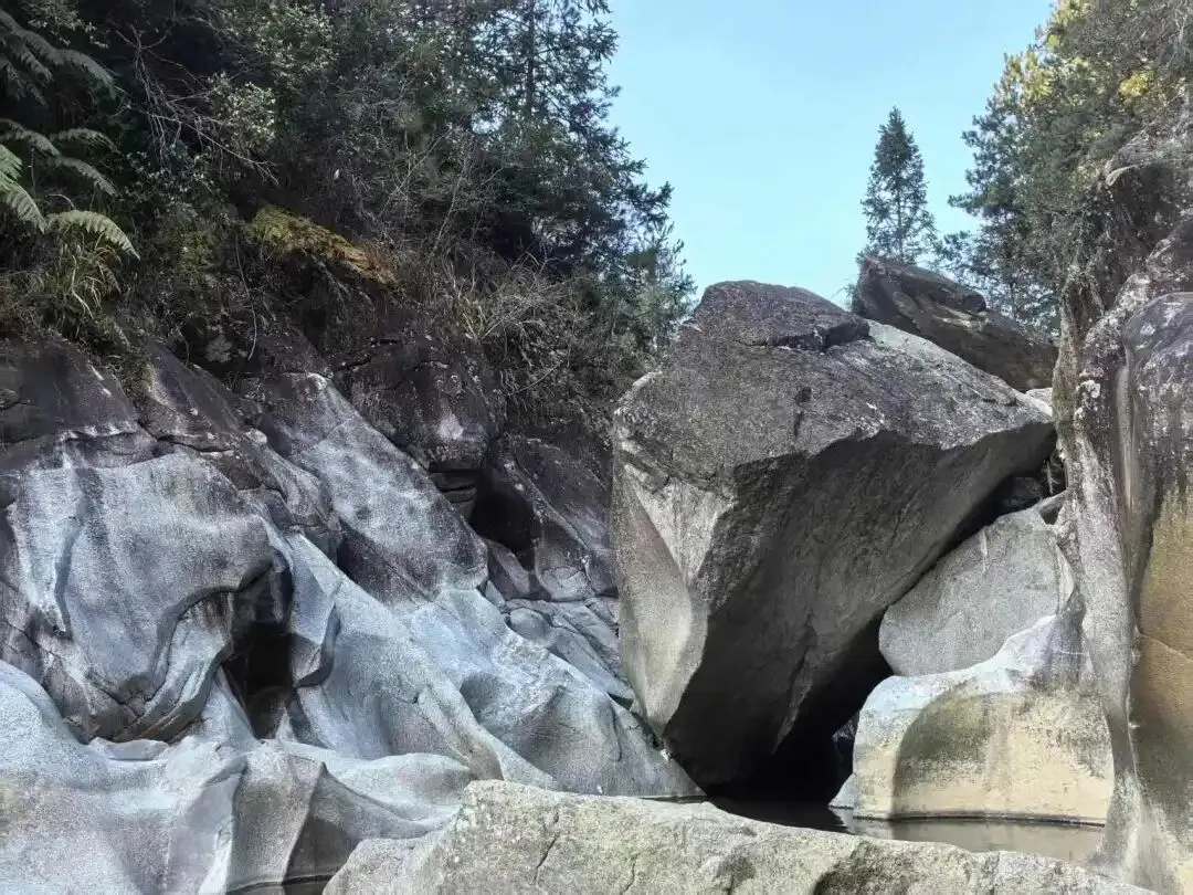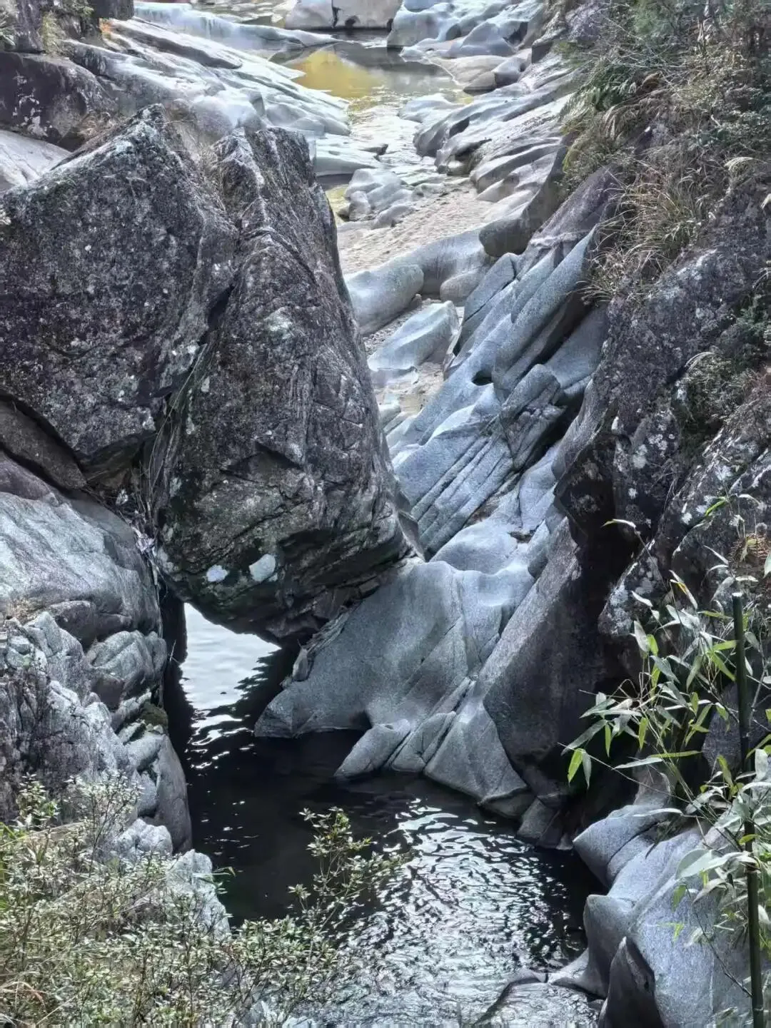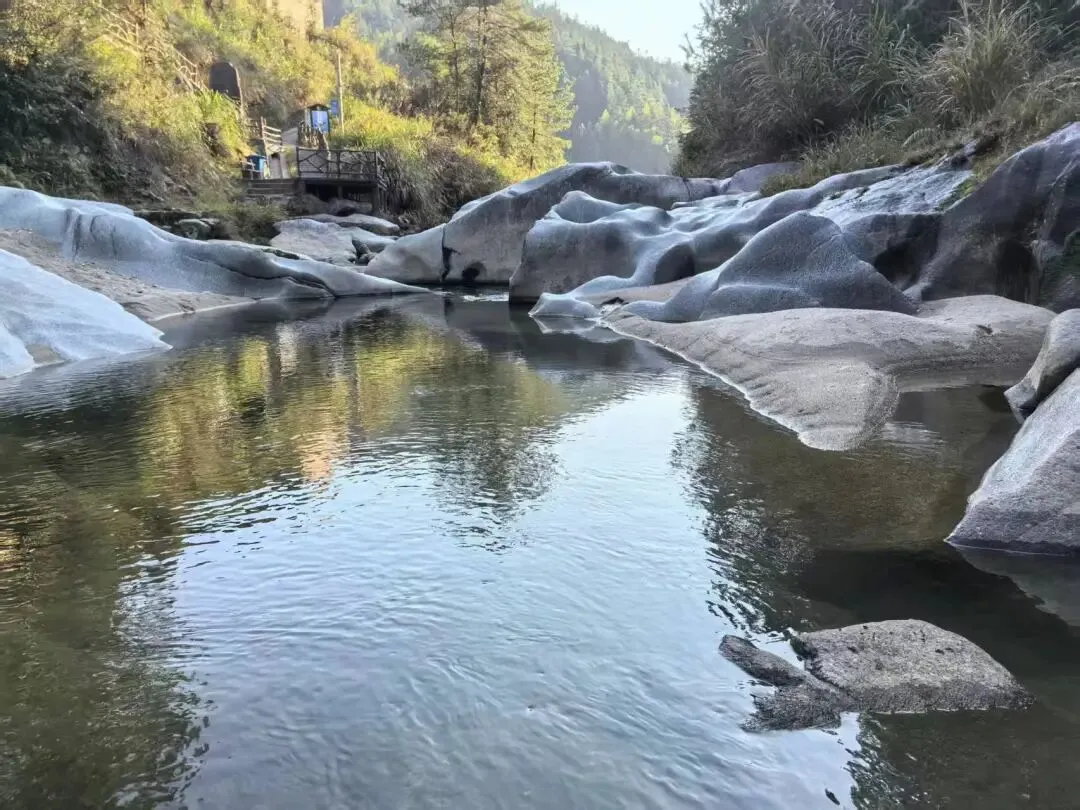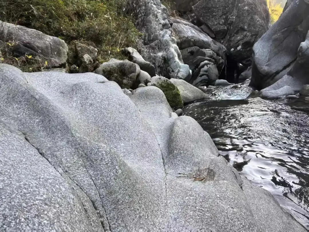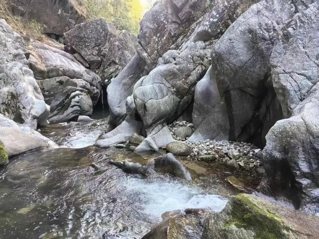 桂东的旅游景点大多数都是免费开放的,当你来到江山冰臼群,还未近前,那淙淙的水流声便先入耳来。走到涧边,视野豁然开朗,一幅地质奇景便毫无保留地铺展在眼前。但见一条清冽的溪流,在嶙峋的乱石间婉转流淌,而溪床中那些星罗棋布、形态奇崛的冰臼立刻攫住你的心神。这些冰臼大小不一,深浅各异,布满了整片花岗岩河床。有的浑圆如碗,边缘光滑流畅;有的深邃如井,口小肚大,幽深的臼底蓄着一汪墨绿色的潭水;有的则如巨大的浴盆,内壁被水流打磨得温润如玉;更有那三五相连,串珠似的排列着,水流依次漫过,形成一叠小小的、白色的瀑花,欢快地跳跃着。