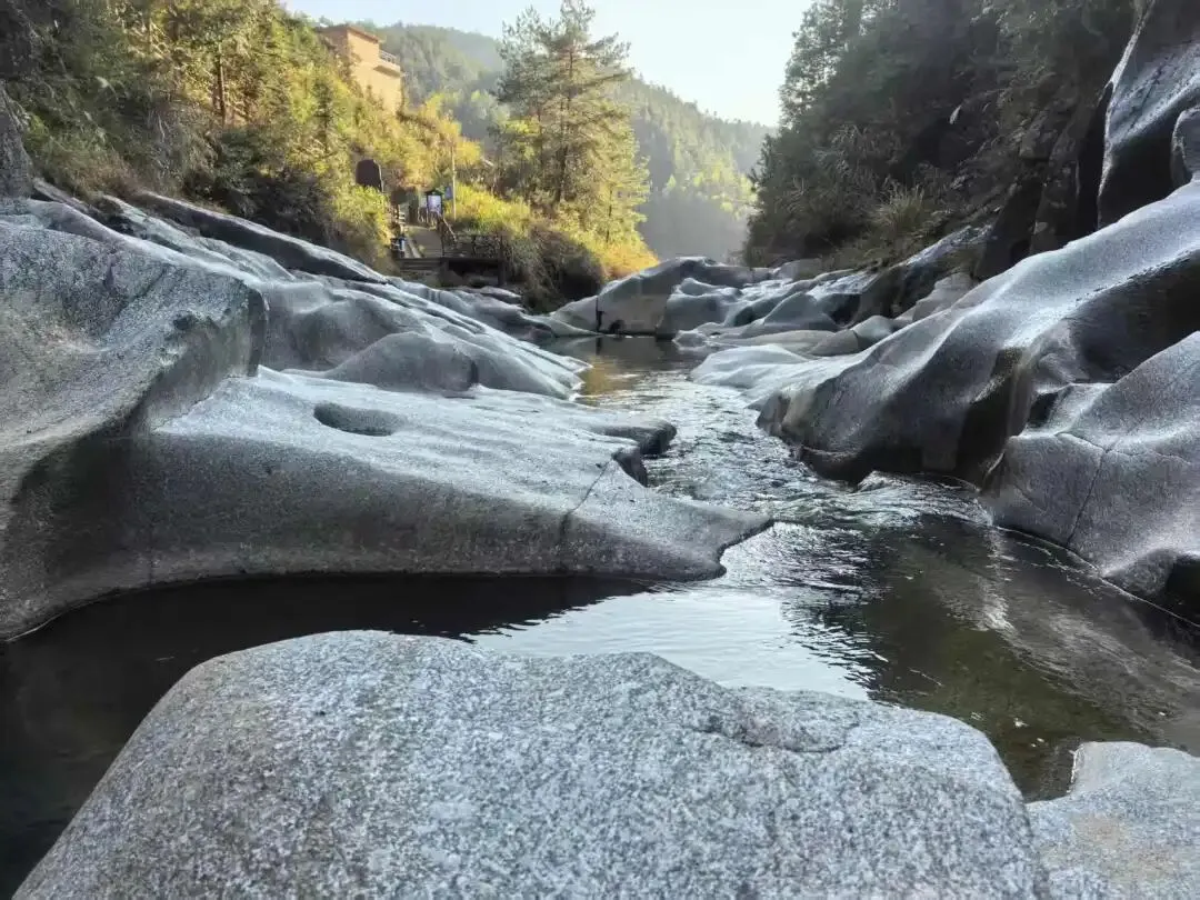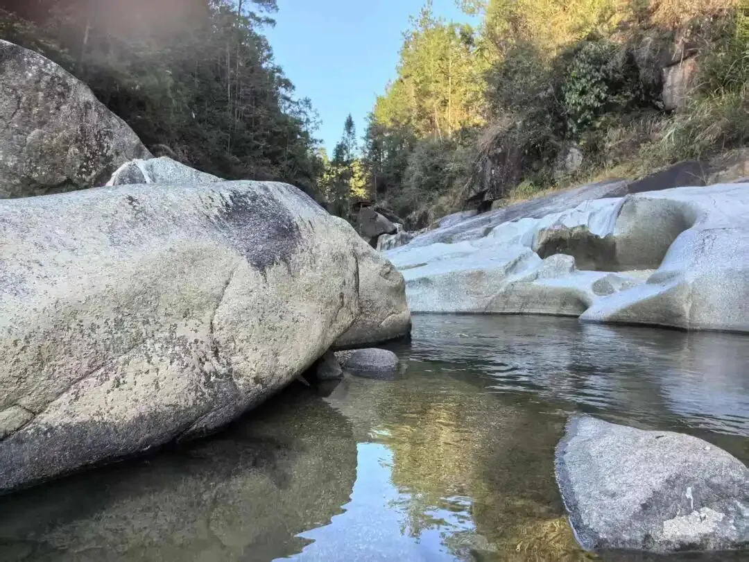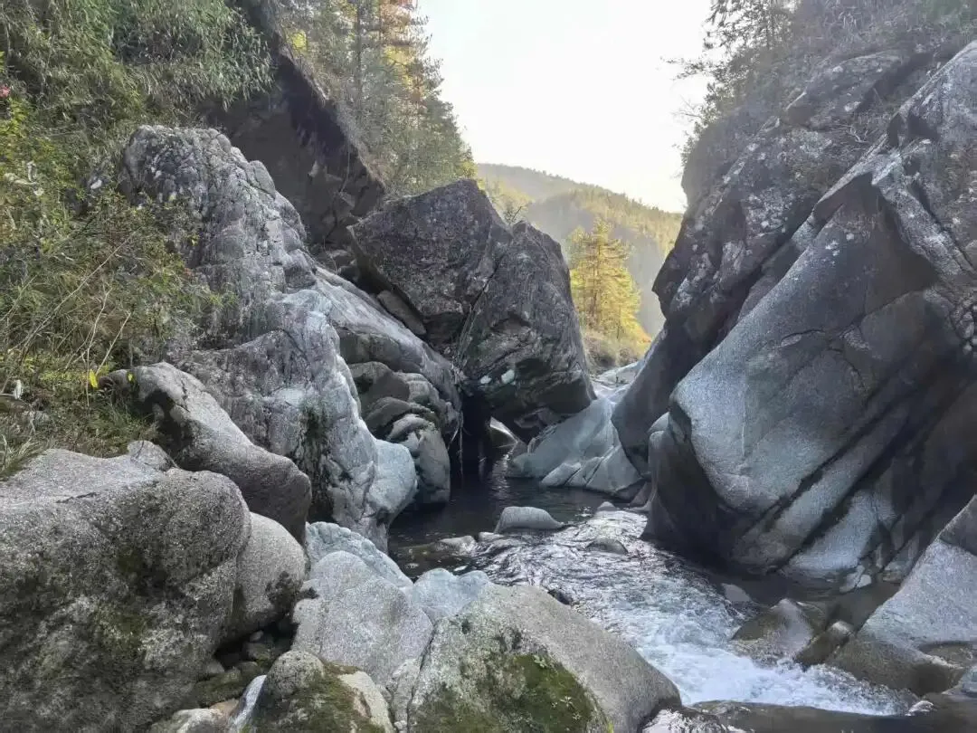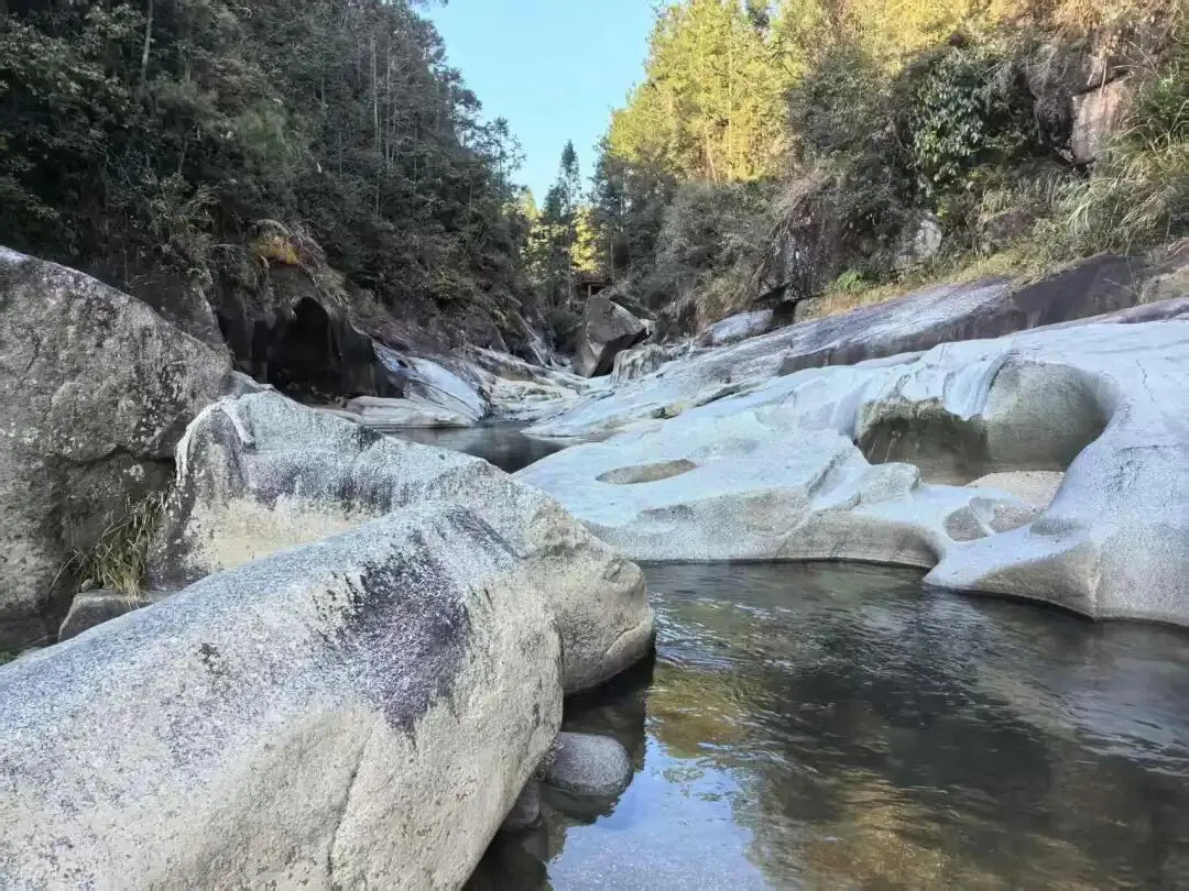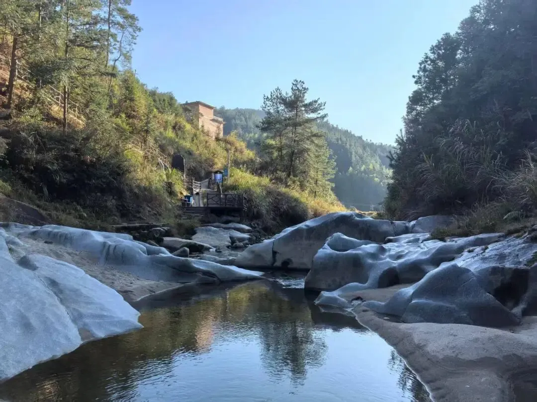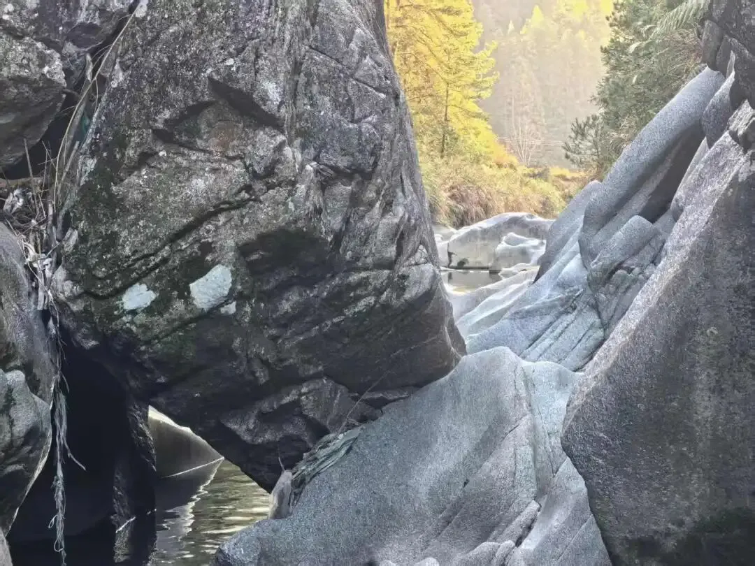 桂东的旅游景点大多数都是免费开放的,当你来到江山冰臼群,还未近前,那淙淙的水流声便先入耳来。走到涧边,视野豁然开朗,一幅地质奇景便毫无保留地铺展在眼前。但见一条清冽的溪流,在嶙峋的乱石间婉转流淌,而溪床中那些星罗棋布、形态奇崛的冰臼立刻攫住你的心神。这些冰臼大小不一,深浅各异,布满了整片花岗岩河床。有的浑圆如碗,边缘光滑流畅;有的深邃如井,口小肚大,幽深的臼底蓄着一汪墨绿色的潭水;有的则如巨大的浴盆,内壁被水流打磨得温润如玉;更有那三五相连,串珠似的排列着,水流依次漫过,形成一叠小小的、白色的瀑花,欢快地跳跃着。