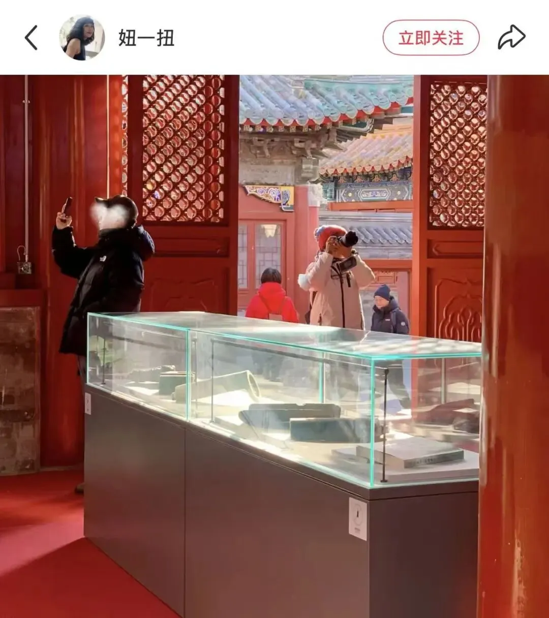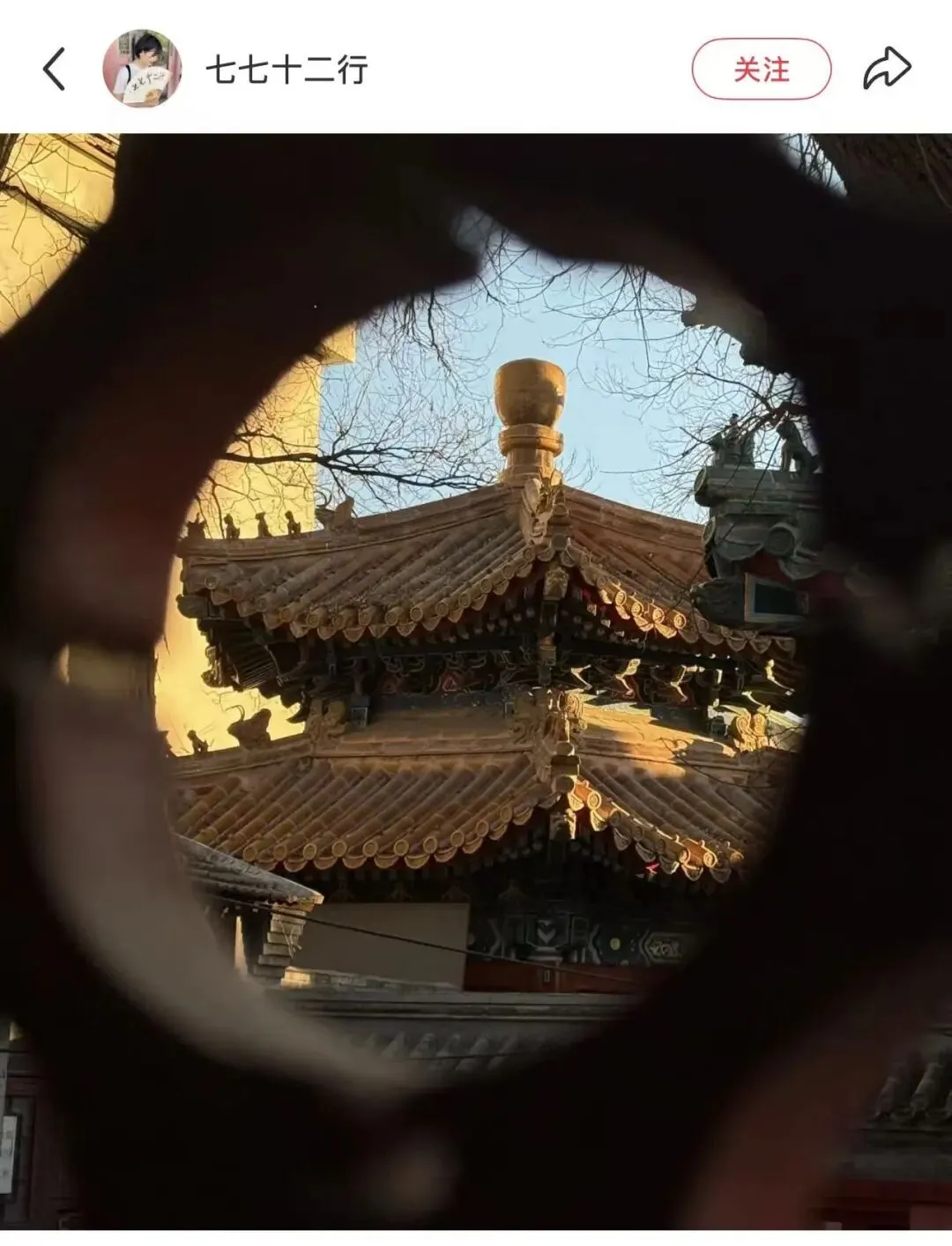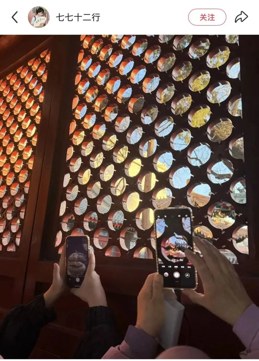 再往里走,好多人围在正殿的窗户前——原来透过镂空花窗拍碑亭,是现在最火的打卡姿势!“我也不知道谁发明的,看大家都这么拍,我也试试!”一位游客笑着说。