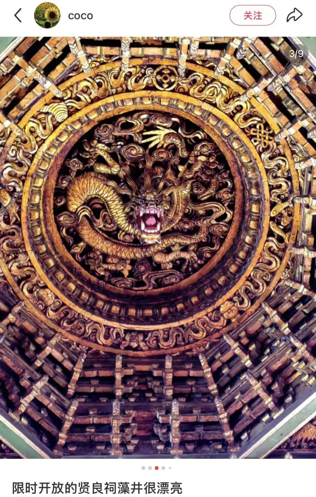 正殿顶上的蟠龙藻井也是一大亮点。这种带龙纹的藻井只有皇家建筑才能用,中间那条龙雕得活灵活现,抬头看时仿佛要扑下来一样,大家都仰着脖子举着手机拍个不停。