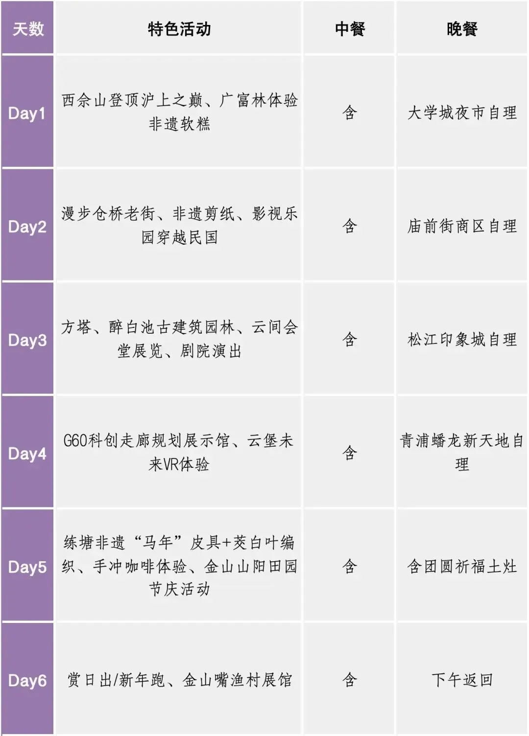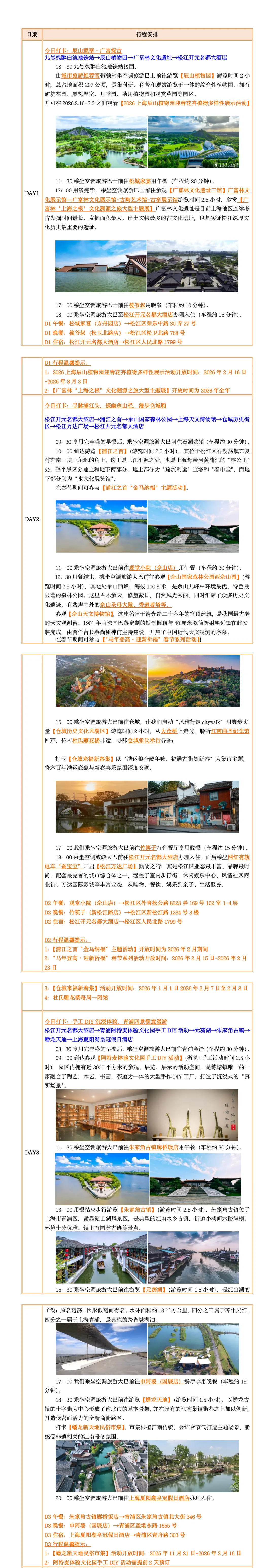 行程不仅深度融合松江“乡村、文化、自然、文创”四大核心资源,还独创性串联松江三大地理文化核心IP:“沪上源起”浦江之首、“上海之根”广富林、“沪上之巅”佘山。从浦江源头的祈愿启程到佘山的山巅祈福,从广富林的文化寻根到云堡未来市的艺术潮玩,兼顾传统与新潮。节日主题活动贯穿全程,非遗体验、美食盛宴、艺术展览层层递进,让游客在新春氛围中全方位感受松江的独特魅力。