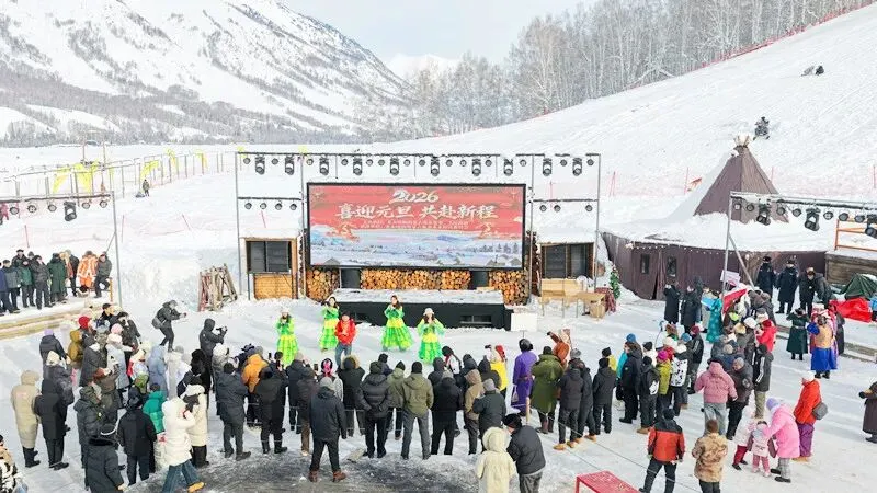 元旦期间,布尔津县举办形式多样的活动,让各族群众在欢声笑语中迎接新一年的到来。禾木喀纳斯蒙古族乡禾木村洪巴斯草原篝火广场灯火璀璨、暖意融融,一场盛大的跨年篝火晚会热烈启幕。当地村民与来自五湖四海的游客欢聚一堂,围火起舞、齐声倒数,在雪域秘境中共赴跨年之约,喜迎2026年的到来。