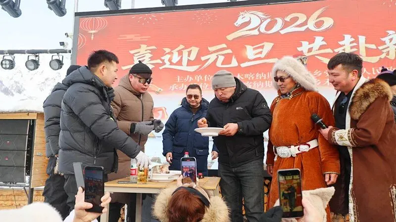 1月1日,禾木喀纳斯蒙古族乡禾木村以“喜迎元旦 共赴新程”为主题举办特色民俗冰雪活动,当地村民与各地游客欢聚雪域禾木,在浓郁的年味与独特的民族风情交融中,共迎2026年新年第一缕美好晨光。