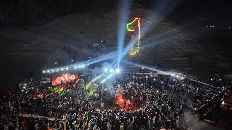 夜幕降临,禾木村的雪原褪去静谧,篝火广场已是人声鼎沸、热闹非凡。歌舞轮番上演,经典曲目悠扬婉转,欢快的集体舞蹈点燃全场热情,让游客沉浸式感受禾木独特的文化魅力。随着跨年倒计时的钟声临近,全场齐声高喊“5、4、3、2、1”,零点时刻,熊熊篝火再度燃起,绚烂烟花划破雪域夜空,欢呼声、祝福声此起彼伏,响彻禾木村的夜空。