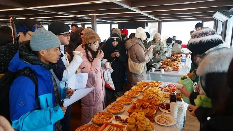 香气扑鼻的羊肉汤、手抓饭等特色美食飘香四溢,游客们边品尝美食边欣赏表演,冰雪的寒凉被浓浓的烟火气与欢笑声驱散。活动现场开展达斯尔达尔汗美食比赛,村民们纷纷大展厨艺,手抓肉、抓饭、薄皮包子、包尔萨克、奶制品、糕点、果酱等禾木经典美食悉数亮相,色泽诱人、风味醇厚,鲜香四溢的美食不仅展现了禾木特色饮食文化的独特魅力,游客既能现场品尝美味,更让旅程充满烟火气与文化韵味,收获别样的冬日旅行体验。趣味十足的大胃王比赛热闹非凡,参赛村民和游客尽情品尝美食,现场叫好声、喝彩声接连不断,欢乐氛围拉满。