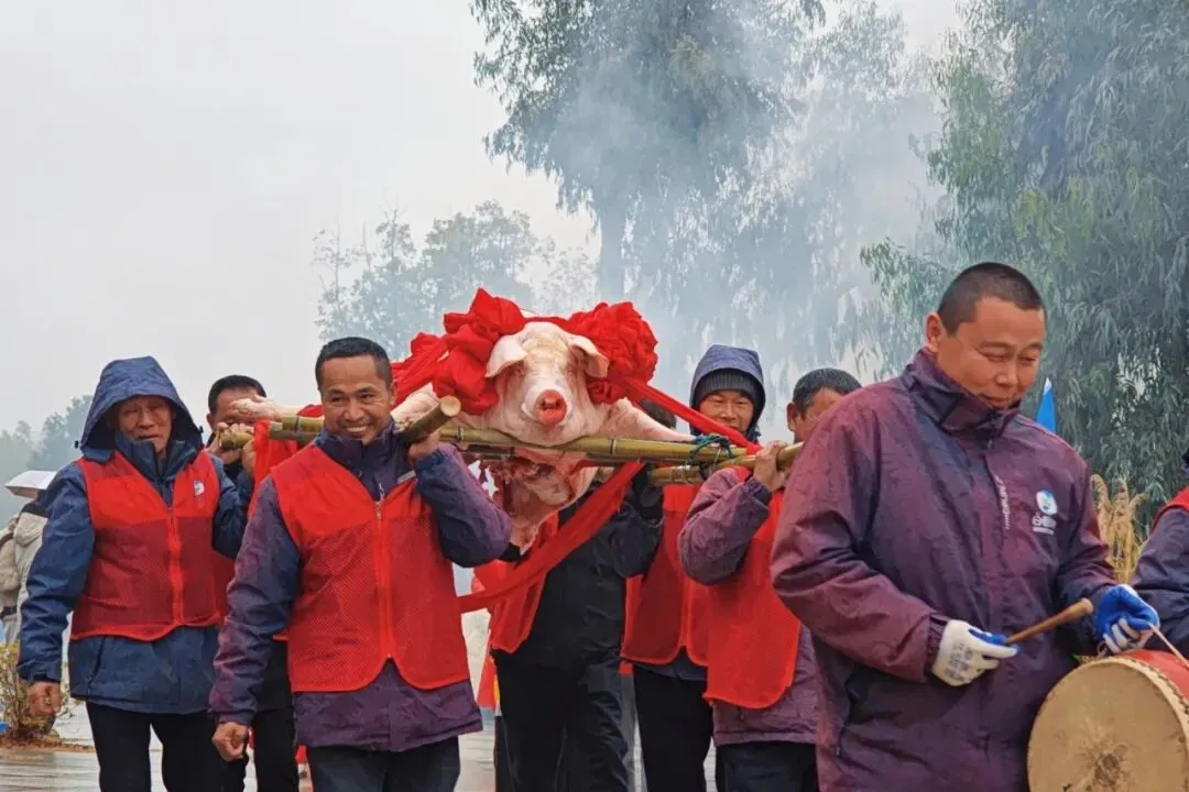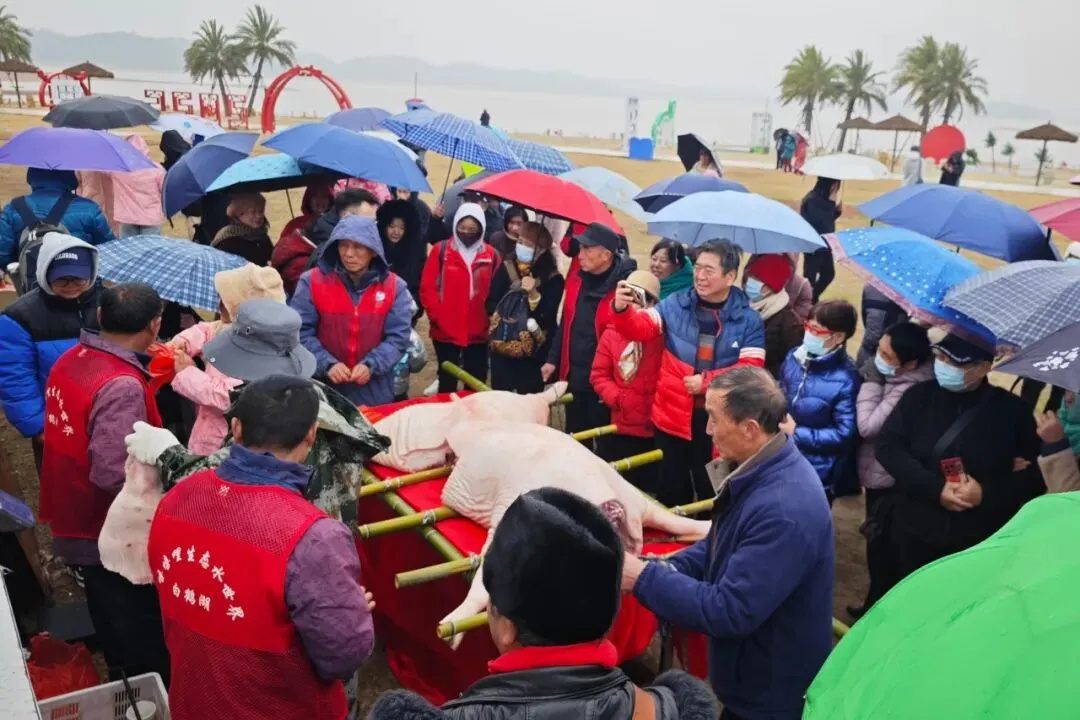 在游客们的热切期待中,工作人员合力抬着披红挂彩的“福猪”隆重入场,瞬间点燃全场气氛!