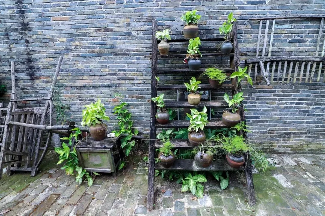 一些常绿的植物爬满了老建筑的墙壁,为斑驳的青砖黛瓦增添了一抹绿意。