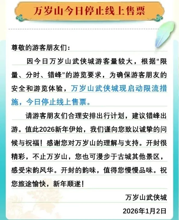 河南万岁山武侠城景区在1月2日13:25发布公告称,因客流量较大,启动限流措施,停止线上售票。