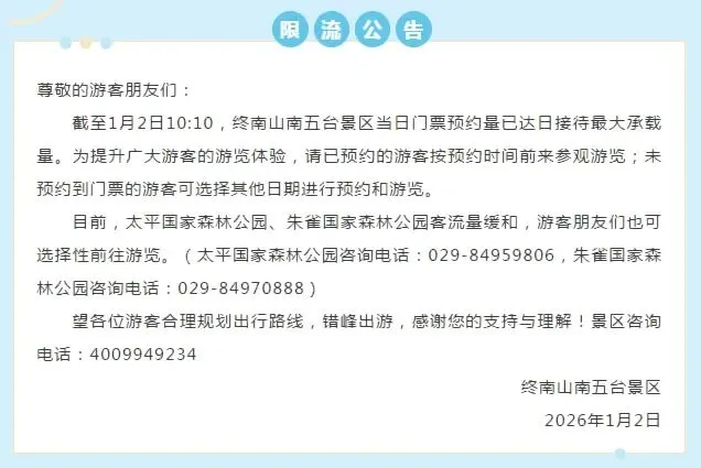1月2日,西安如终南山南五台景区发布的公告显示,截至1月2日10:10,终南山南五台景区当日门票预约量已达日接待最大承载量。