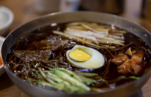冷面本身也很有意思。汤头冰凉但不寡,酸甜平衡得很克制,像一条清亮的银线从喉咙滑下去。夏天吃是解暑,冬天吃反而更带劲。不过不吃也没关系,延吉的餐桌选择太多了。