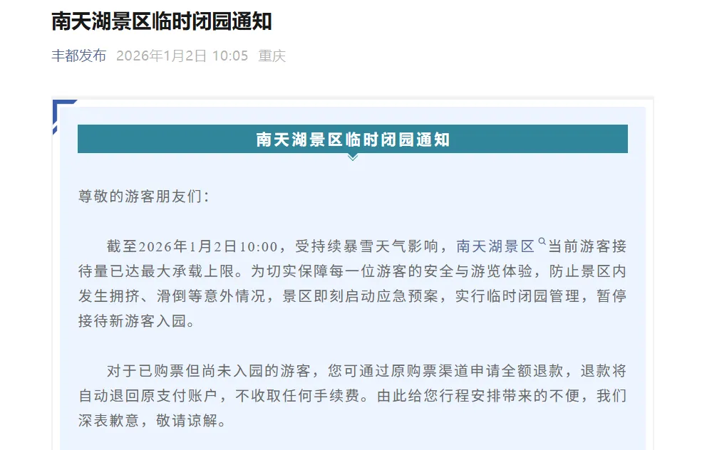 1月2日,重庆南天湖景区、仙女山景区先后发布景区临时闭园的通告。