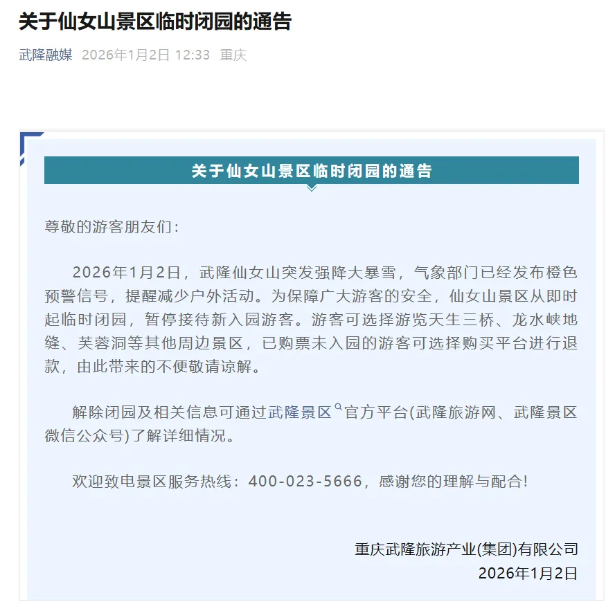 2026年1月2日,武隆仙女山突发强降大暴雪,气象部门已经发布橙色预警信号,提醒减少户外活动。为保障广大游客的安全,仙女山景区从即时起临时闭园,暂停接待新入园游客。游客可选择游览天生三桥、龙水峡地缝、芙蓉洞等其他周边景区,已购票未入园的游客可选择购买平台进行退款,由此带来的不便敬请谅解。