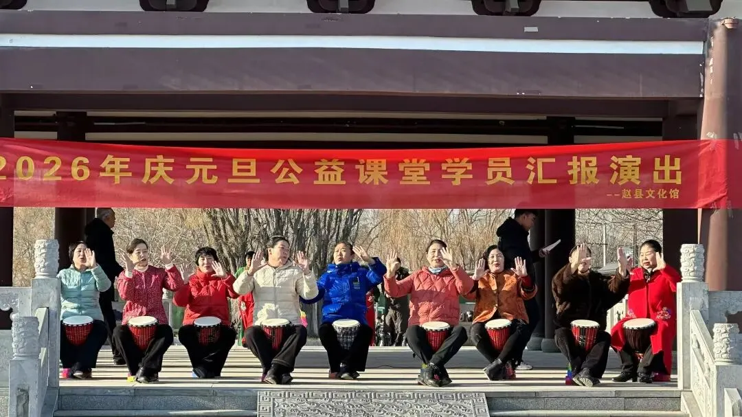 下午的百戏楼同样欢声不断,“庆元旦公益课堂学员汇报演出”在这里举行。本土公益艺术培训课堂的学员们载歌载舞,用精心准备的节目迎接新年。《开门红》拉开了演出序幕,红红火火的舞蹈瞬间点燃现场;《春光十万里》唱出了对美好生活的向往;《不忘初心》的深情旋律唤起共鸣;《幸福中国一起走》则唱出了人们共同的心声。从《梨花颂》的婉转到《骏马奔驰保边疆》的豪迈,从舞蹈《中国美》的绚烂到《映山红》的经典重现,节目精彩纷呈,展现了赵县群众文化的蓬勃生机。