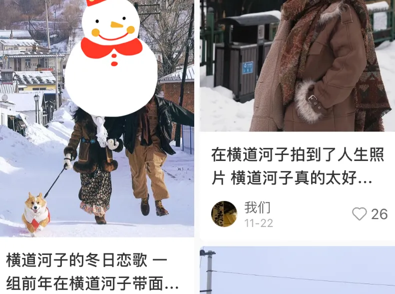所以最近景点中好评最多的居然是中央大街—— 建筑漂亮倒还在其次,主要是两边全是小店,冷了随时都能进去躲躲。 哈尔滨旅游、东北旅游这波热度从社交网络上来。隔着屏幕,人们很容易只看到美、浪漫的一面。 但从本质上来讲,冬天的东北游更类似前两年爆火的新疆游—— 有相对稀缺的景色,但也会吃一些平时出门玩不会吃的苦头。 就拿前阵子刚火成“雪景天堂”的横道河子,厚厚的积雪、氛围感房屋吸引了多少城市白领,恨不得立刻套上复古皮衣、天鹅绒长裙拍下人生照片。