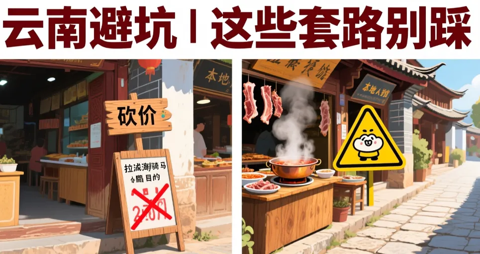 古城消费:丽江古城内的银饰、玉石价格虚高,如需购买请认准正规店铺并砍价(可按标价 1/3 尝试); 低价拉客:古城门口或车站的 “低价导游”“免费接送” 多为购物团引流,切勿轻信; 骑马陷阱:拉市海周边的骑马项目报价混乱,提前问清全程费用(含接送、骑马时长),避免中途加价; 餐饮避坑:古城内餐馆价格偏高,可到忠义市场、大理洋人街周边的本地人餐馆用餐,性价比更高; 门票预订:玉龙雪山大索道门票旺季紧张,提前 3 天在官方平台预订,避免当天买不到票。