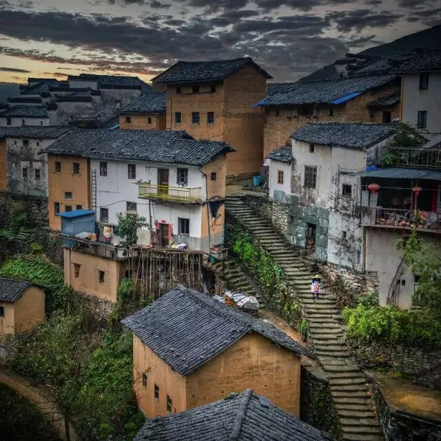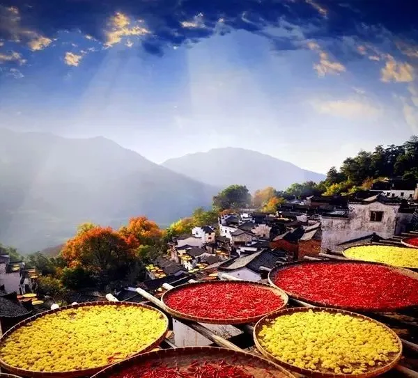 白墙黑瓦的房子顶上晒起火红的辣椒