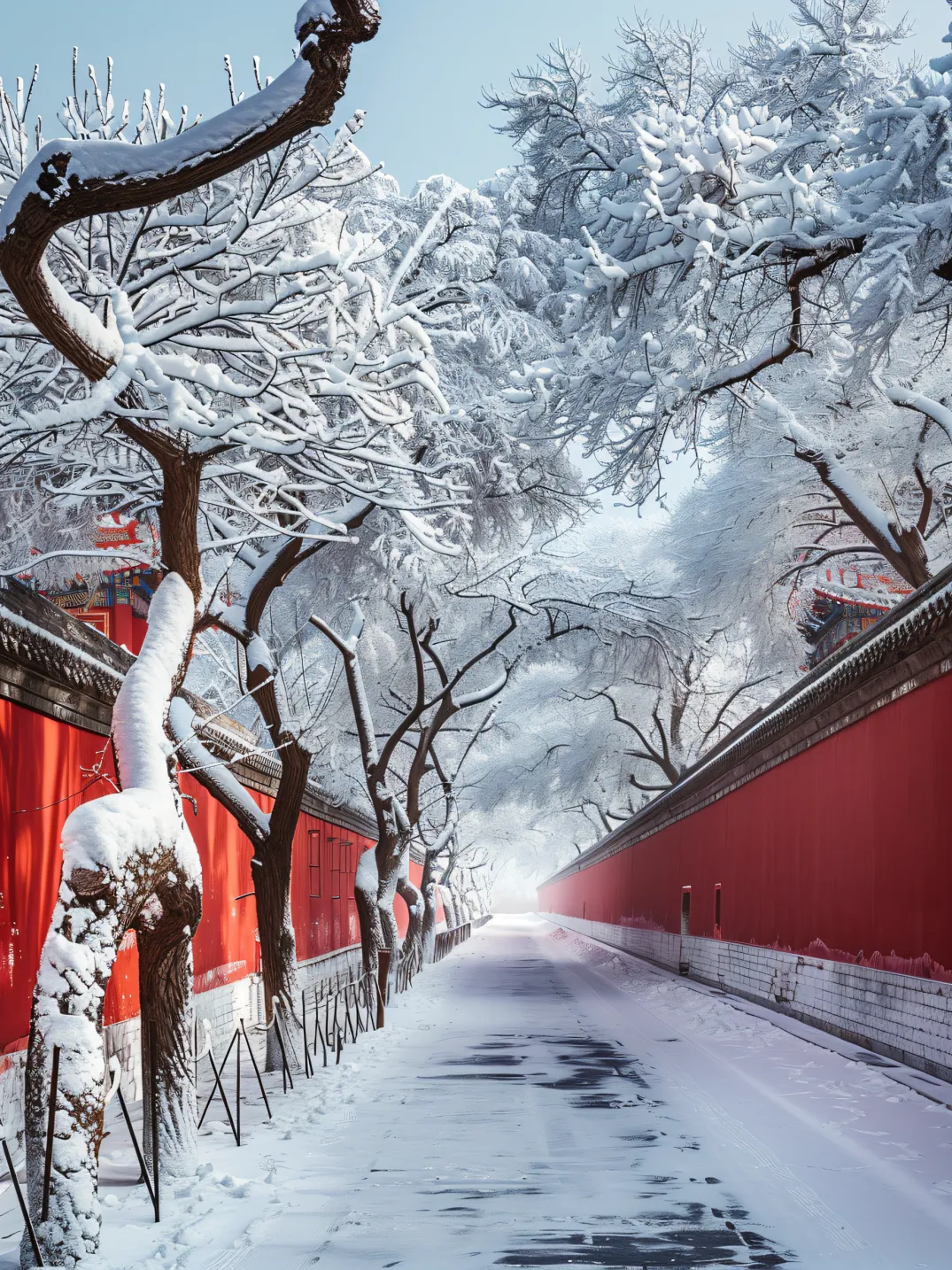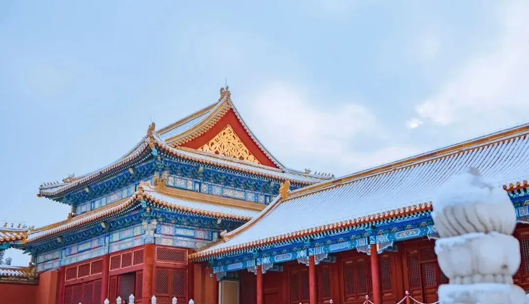 红墙金瓦在白雪的映衬下更显得肃穆,