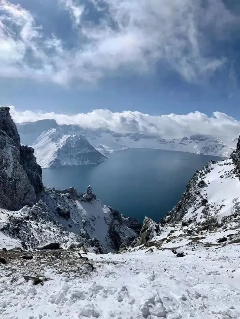 雪峰环绕的天池从蓝宝石变成纯白珍珠,
