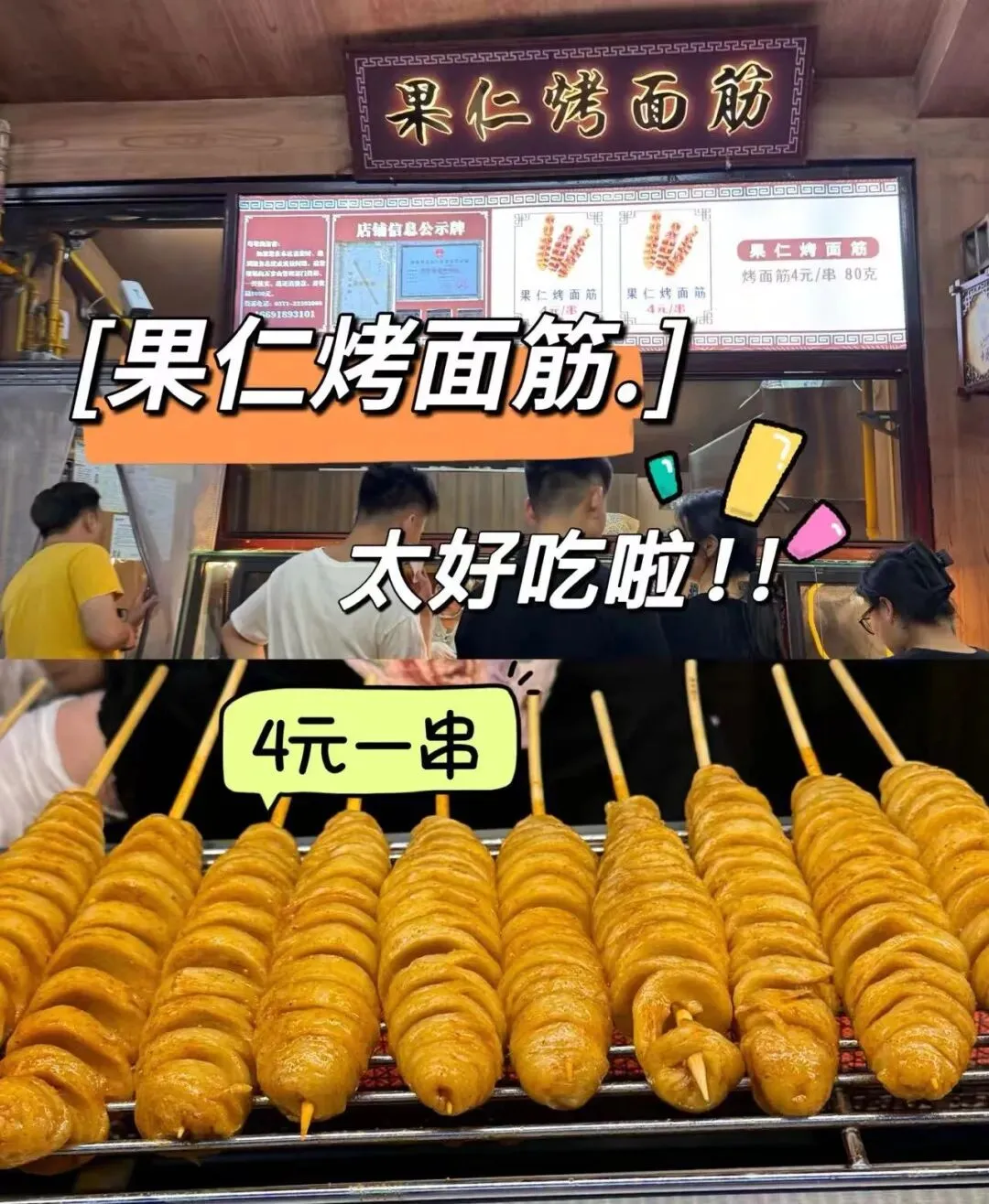 - ✅ 果仁烤面筋(4 元 / 串):性价比超高,面筋厚实,果仁香气十足