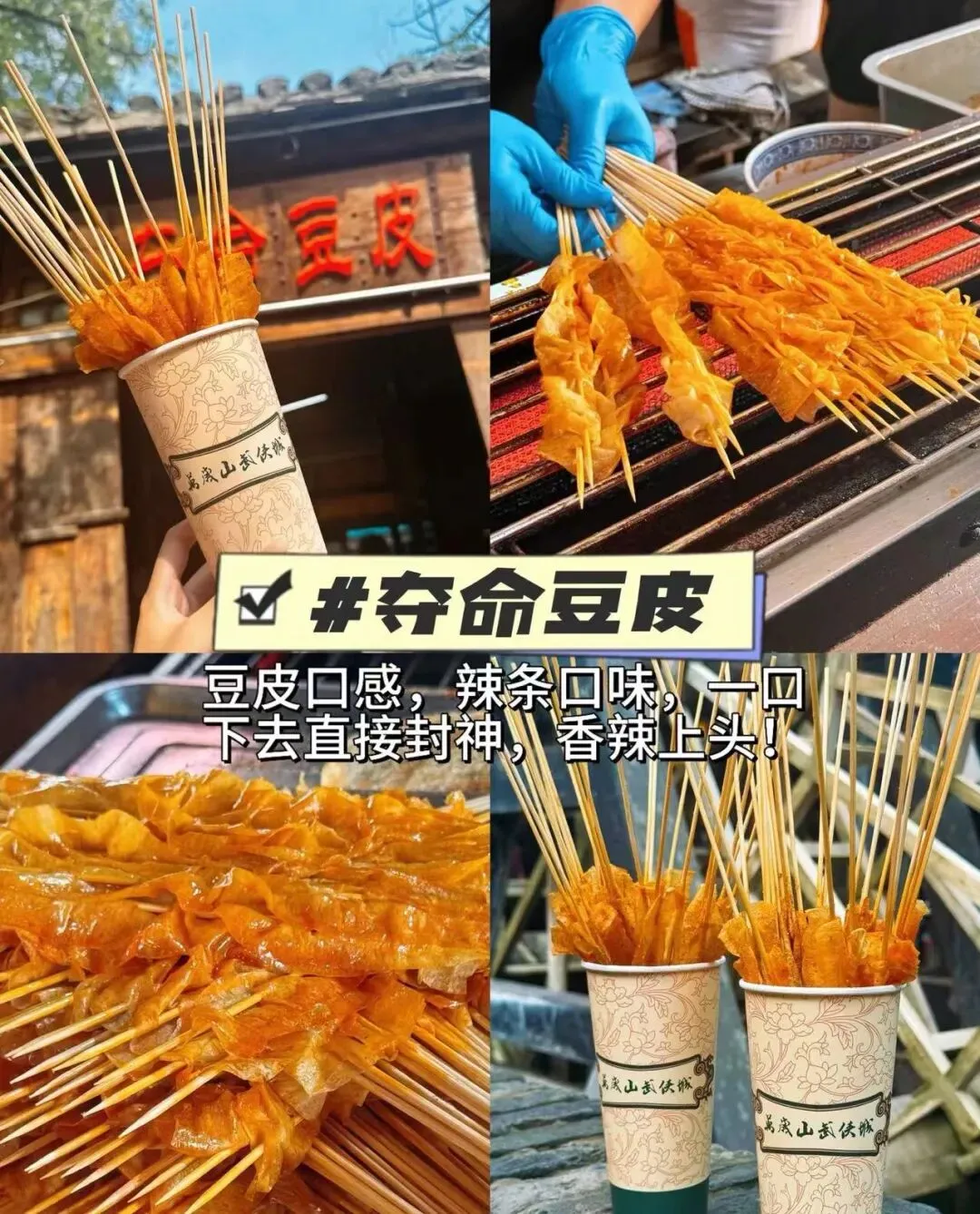 - ✅ 夺命豆皮(10 元 / 份,风雪山神庙对面水车旁):酱香浓郁,口感筋道,必点小吃之一