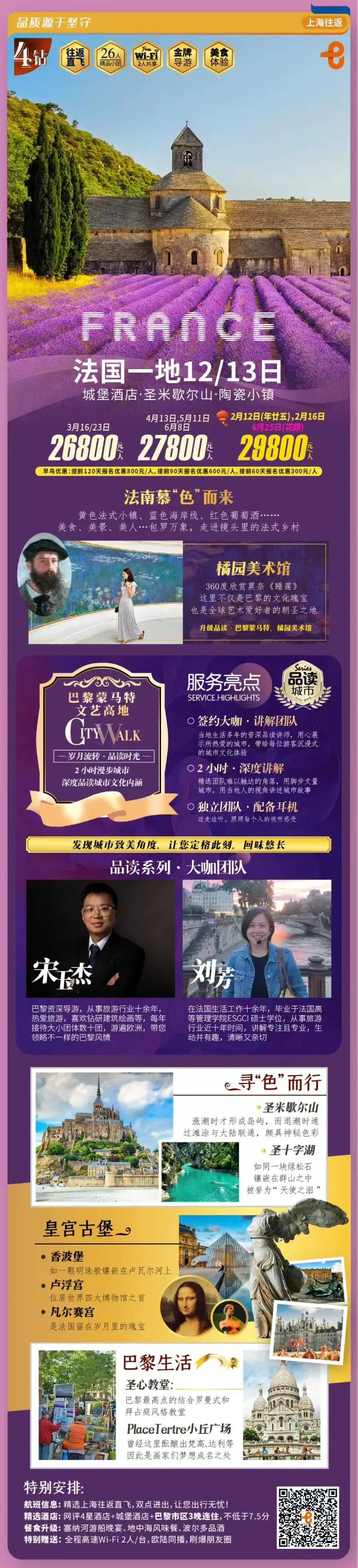 ✅王室传奇:香波堡的浪漫穹顶、凡尔赛宫的镜厅辉煌、卢浮宫的蒙娜丽莎微笑,每一步都是电影般的沉浸感。