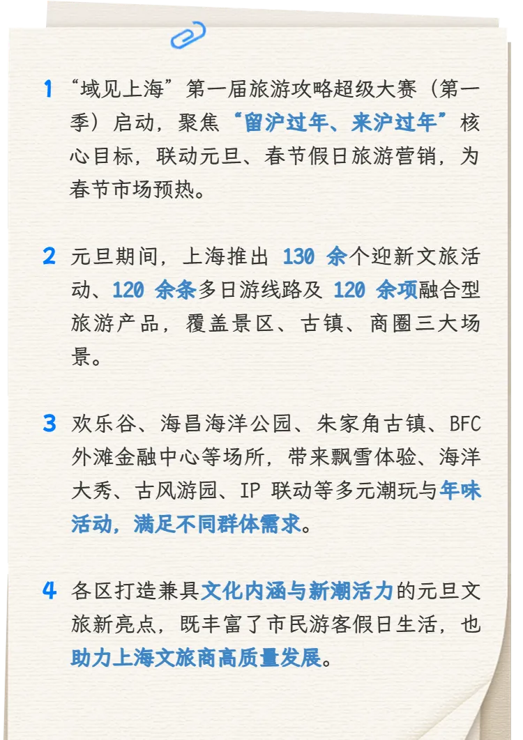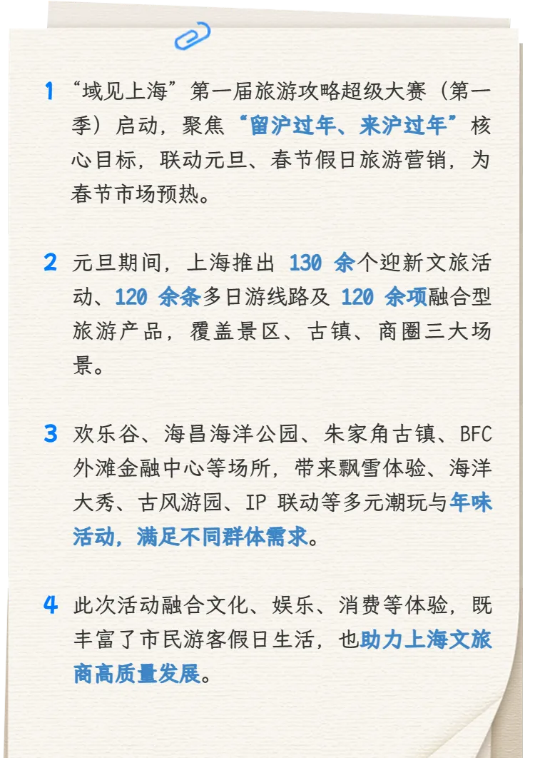 “域见上海”第一届旅游攻略超级大赛(第一季)启动以来,紧密围绕“吸引上海市民留沪过年、外地游客来沪过年”的核心目标,与2026年元旦、春节假日旅游产品开发营销工作同频共振、一体推进,推动大赛已经成为赋能市场主体、发展“多日旅游”、扩大服务新消费、预热春节市场的关键抓手。元旦期间,组织推出直接面向市民游客的元旦迎新主题文旅活动130余个,一至三日游旅游线路产品120余条,融合景区(点)、酒店和乡村民宿的旅游产品120余项,丰富市民游客的新年假日文旅生活。