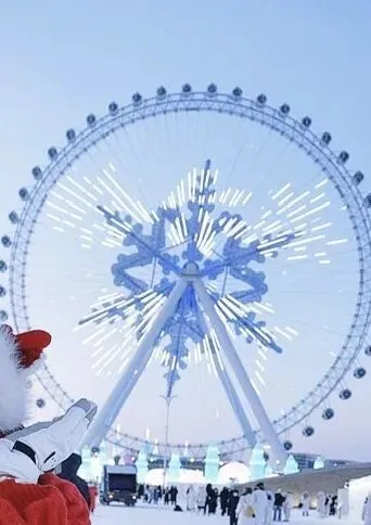 冬天江面全结冰了!可以体验冰上自行车、雪圈等项目。傍晚运气好的话能看到绝美日落+夜景摩天轮