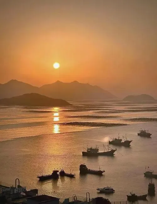 5、花竹村。霞浦观赏日出的绝佳景点。位于宁德市霞浦县三沙镇花竹村。花竹村居高临下水天相连,有着一望无际的景深。近景浮标鱼竿,中景鱼排木屋,远景岛屿帆影,整个场景井然有序。花竹还是观赏福瑶列岛全景的最佳地点,尤以日出最为壮观。